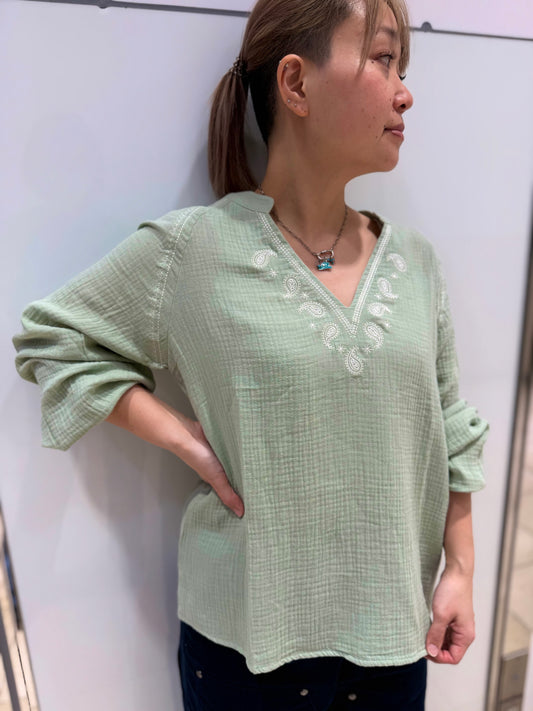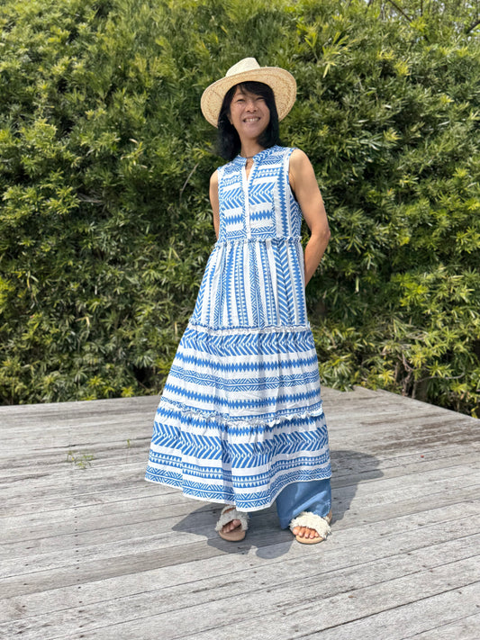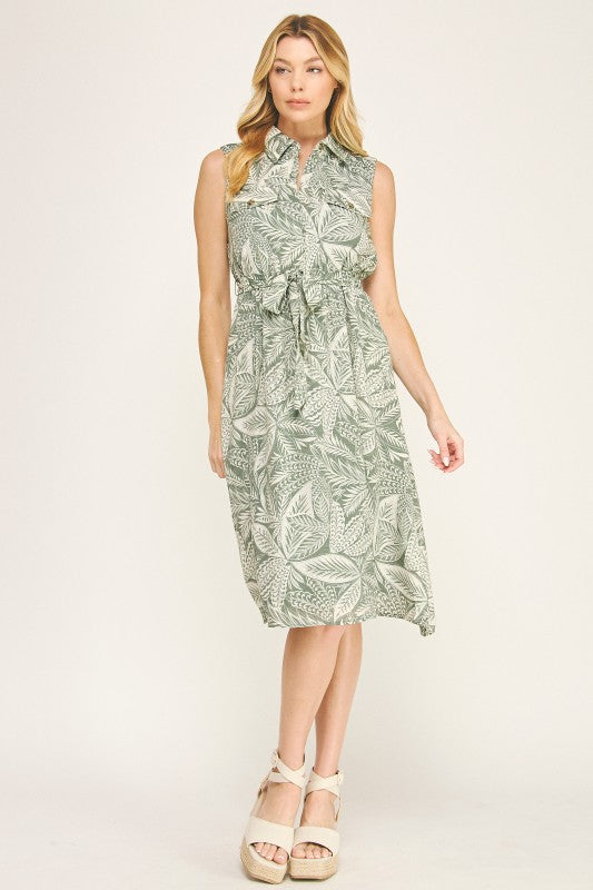 リーフ柄 ミディ丈ノースリーブワンピース セージ