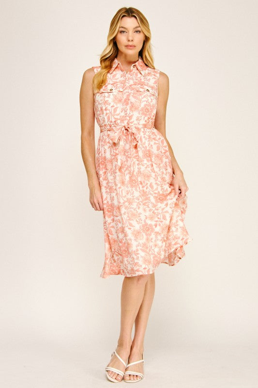 フローラル柄 ミディ丈ノースリーブワンピース コーラルピンク
