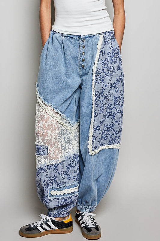 POL クロシェ&レース切替 デニムジョガーパンツ