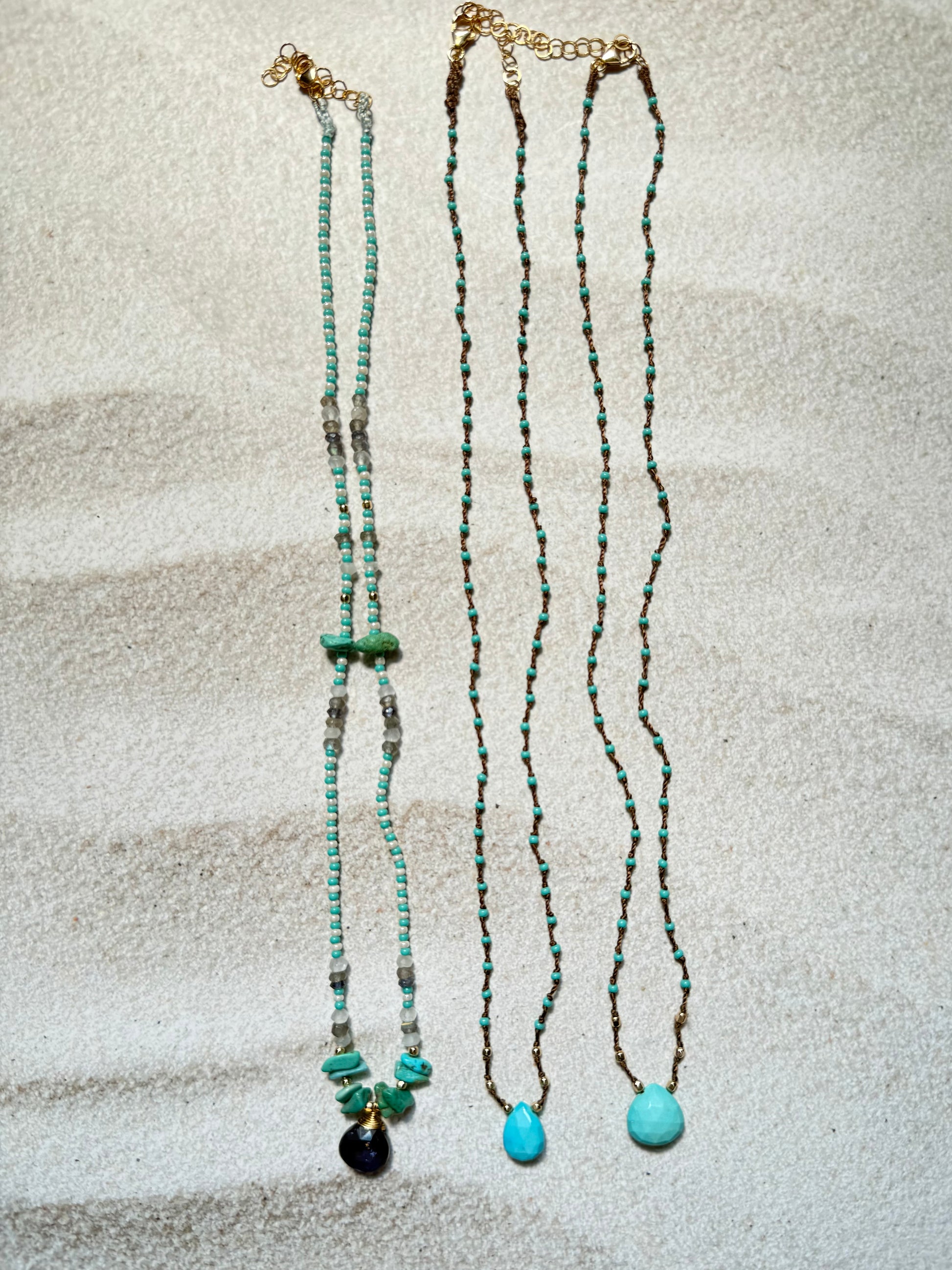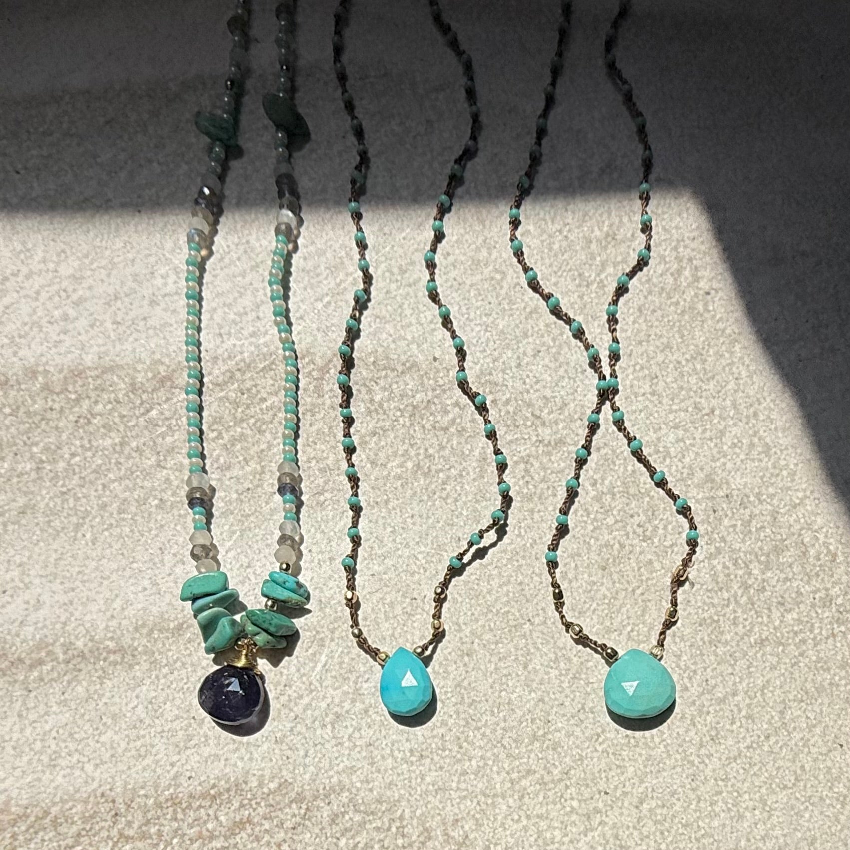アメリカ・ロサンゼルスのハンドメイドジュエリー「マチュピチュジュエリー」天然石とビーズを使った"ジョアンナコレクション"トップが直接コードに編み込まれた新タイプネックレスです。