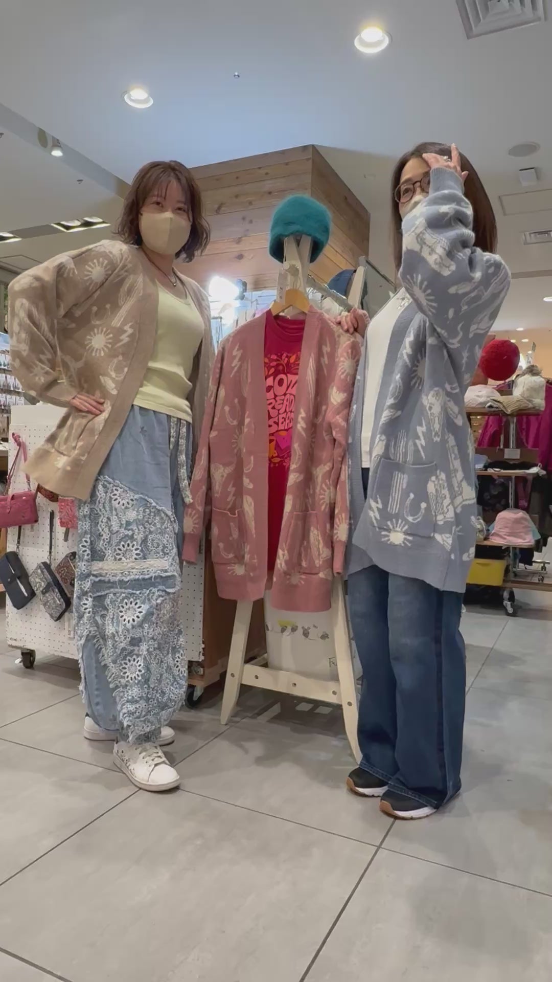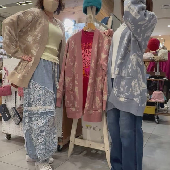 LAインポート「VERYJ」柔らかなカラーにウエスタン調のグラフィック柄を編み込んだ、存在感のあるオーバーサイズニットカーディガン。