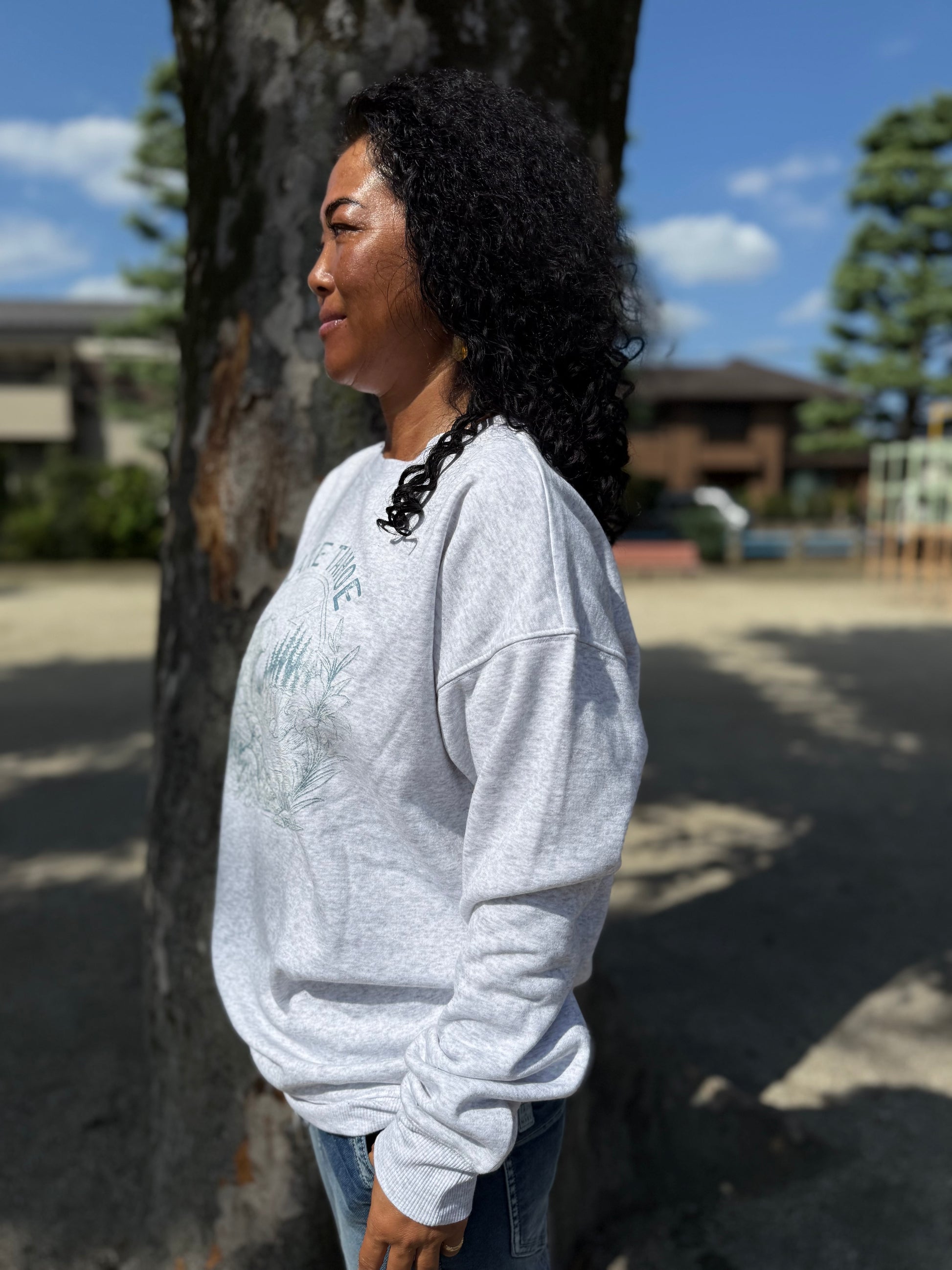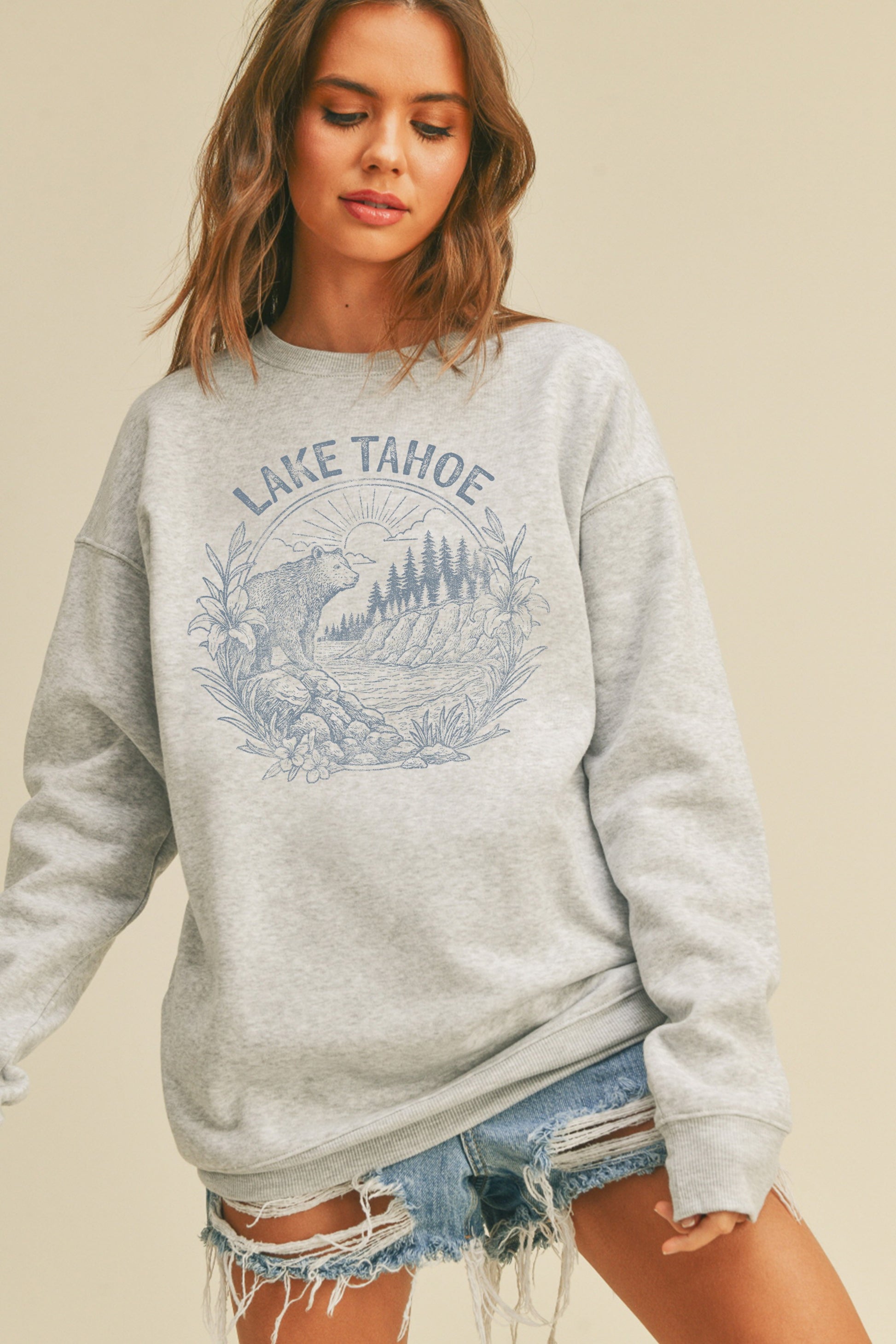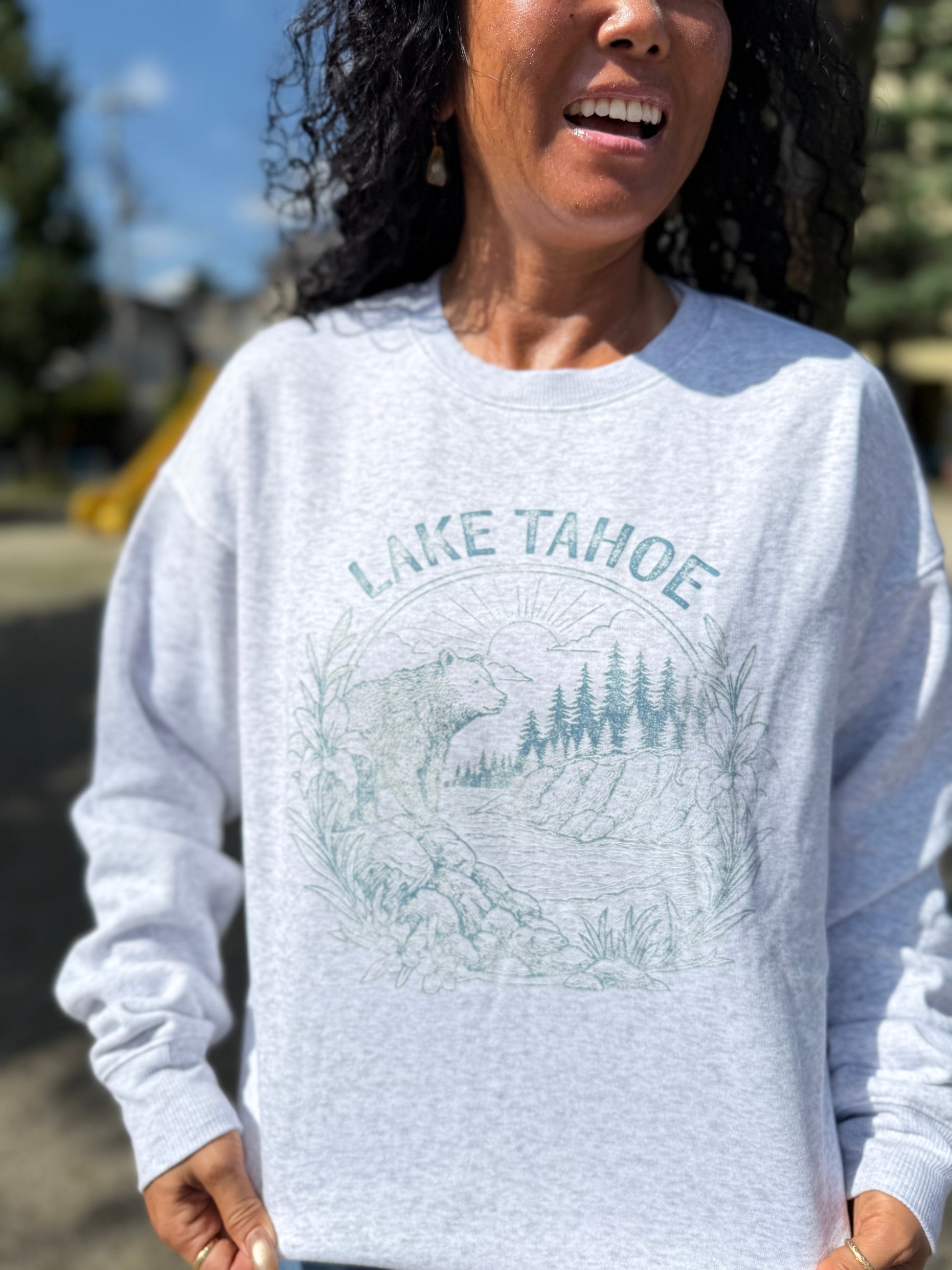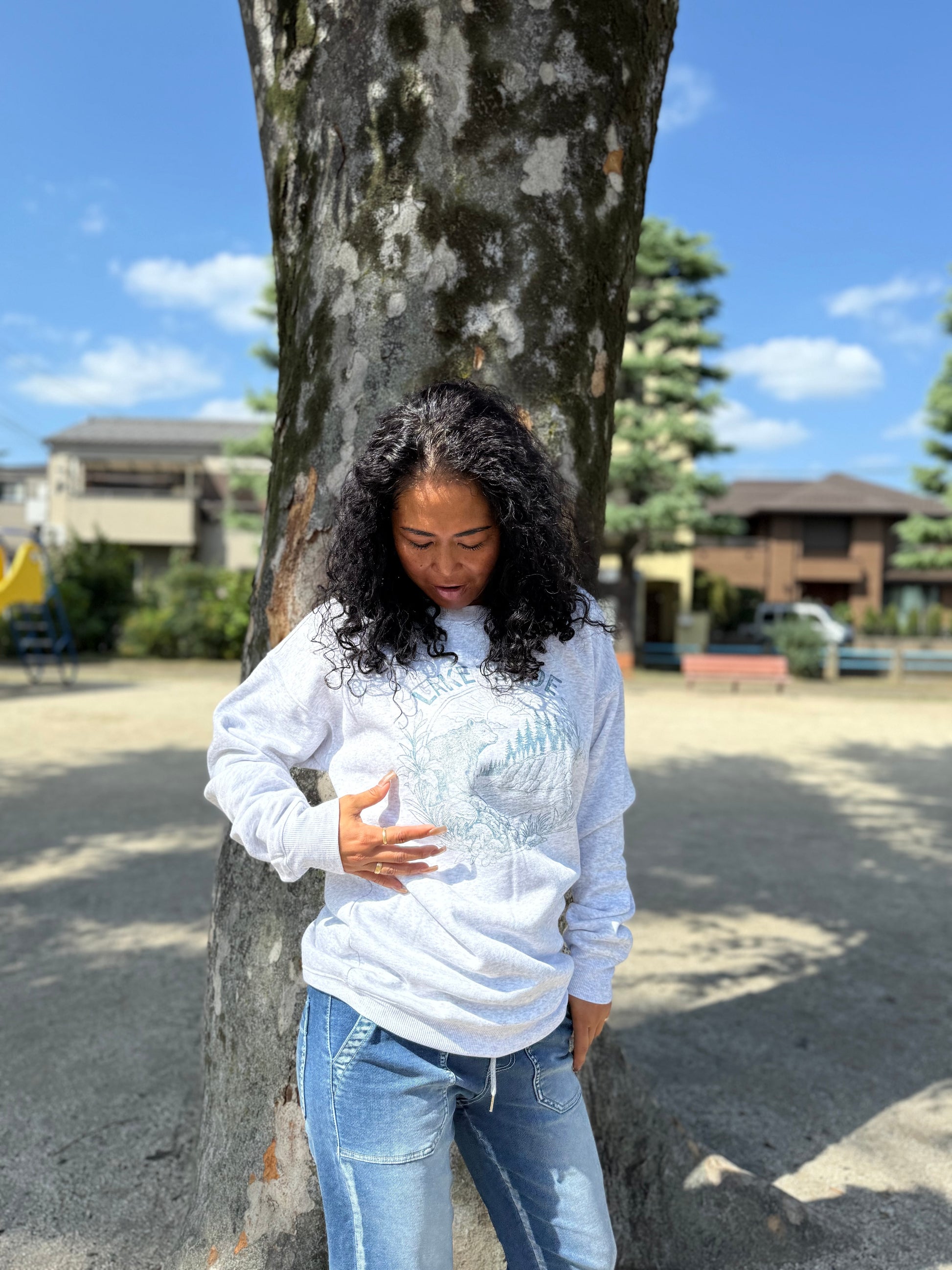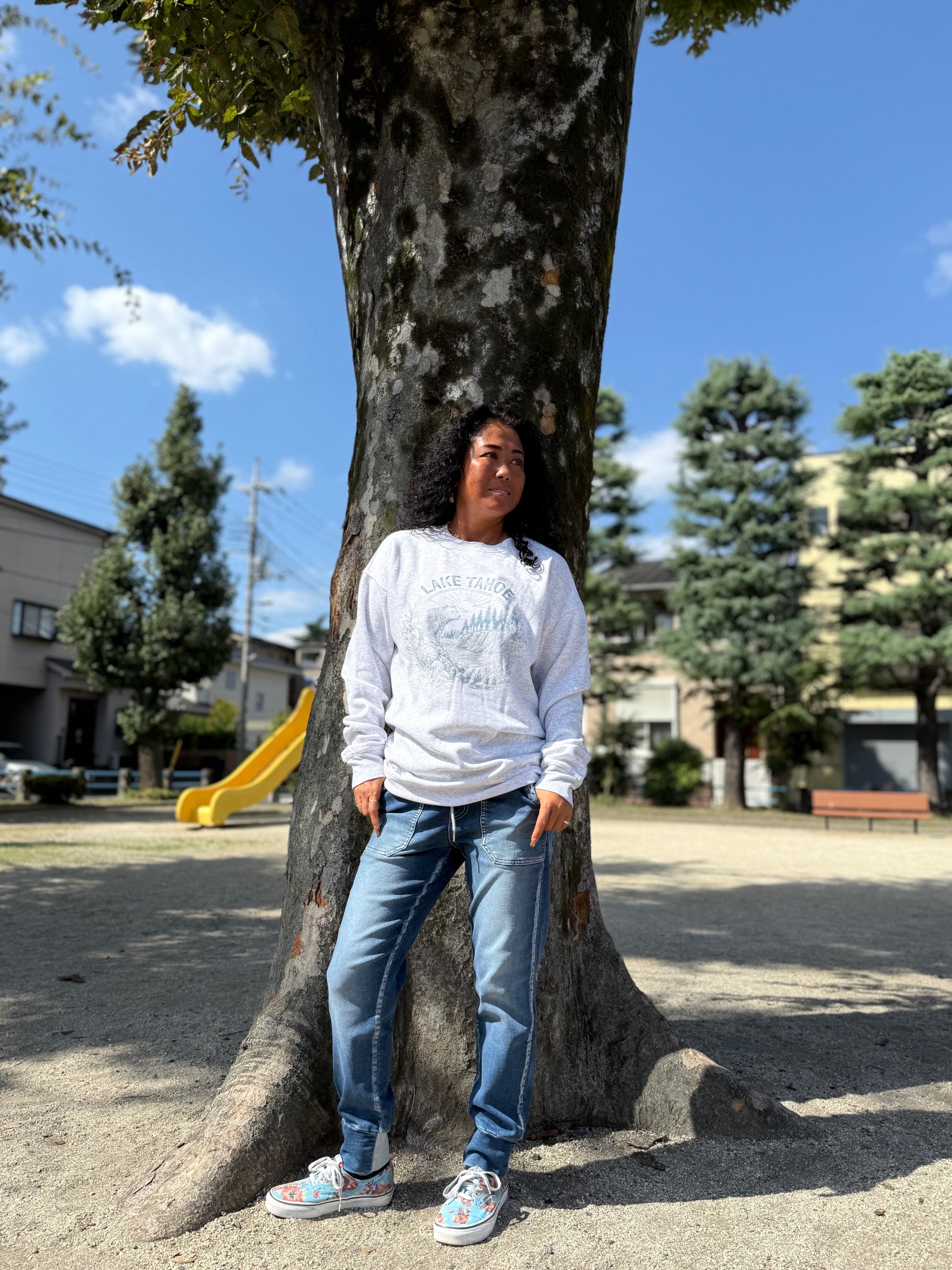 LAインポート「Honestee」の「Lake Tahoe」の文字とを描いた、レイクタホの自然を描いたグラフィックが印象的なスウェットトップ。