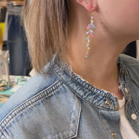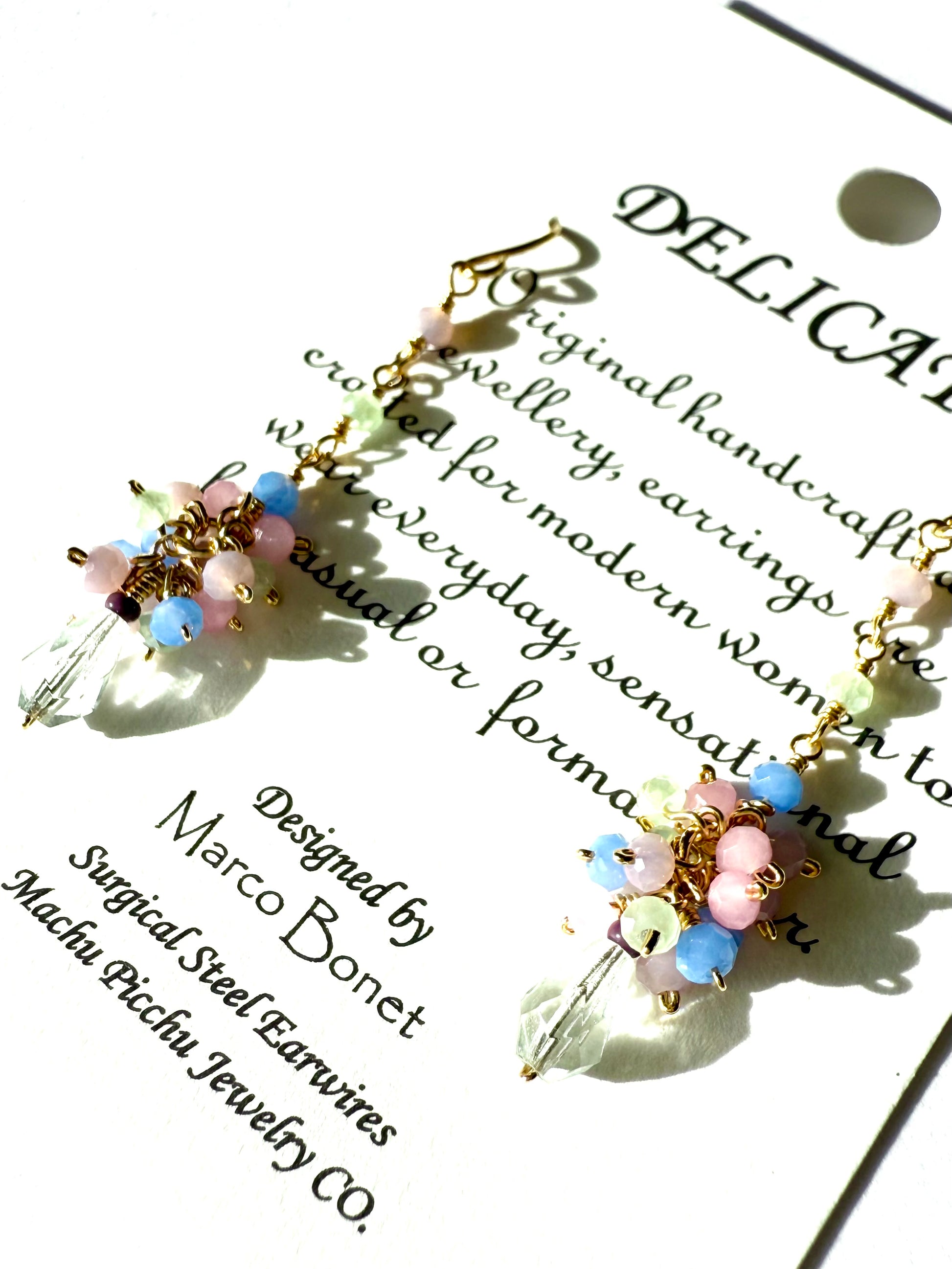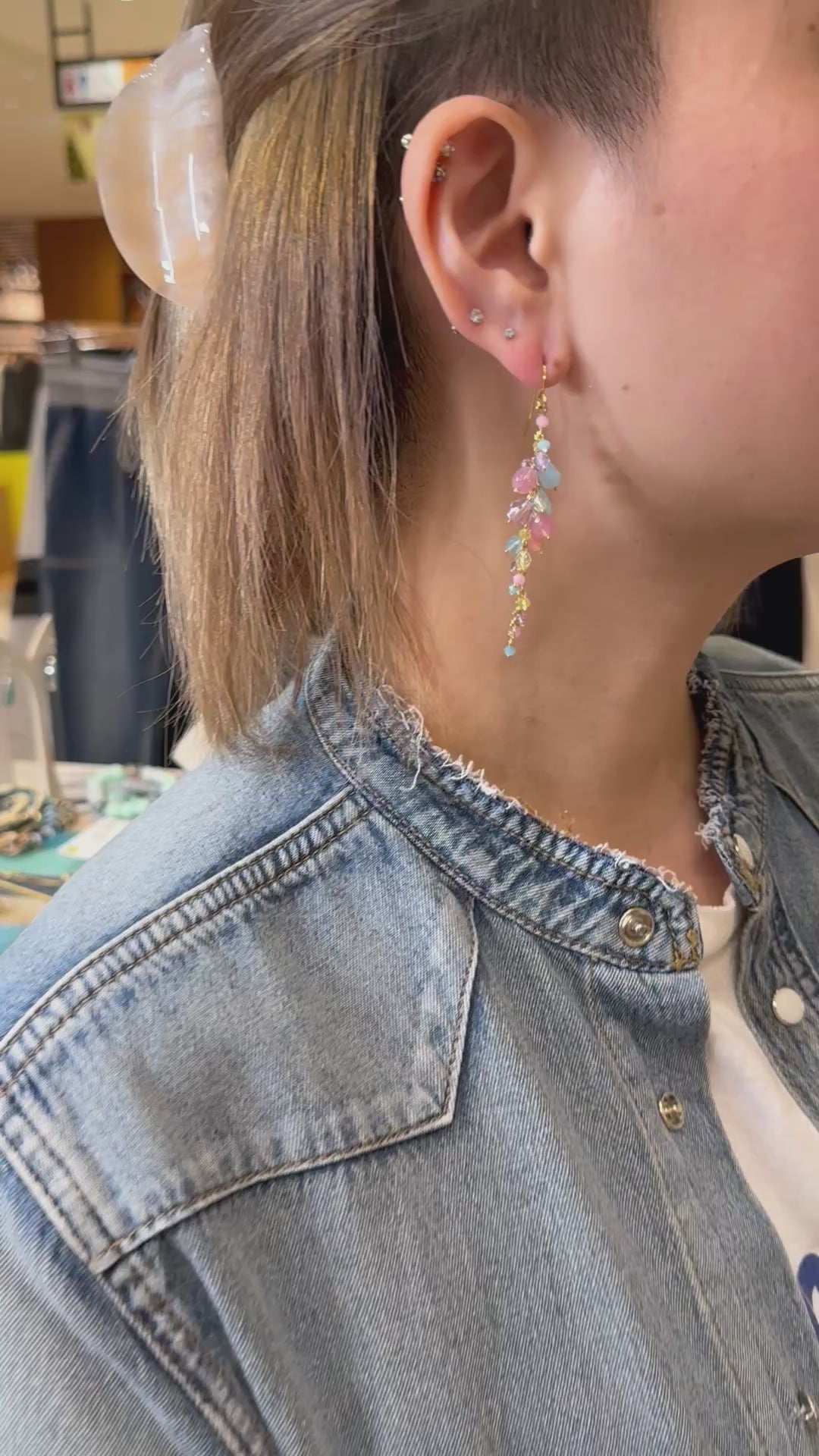 アメリカLA発のハンドメイドジュエリー 「マチュピチュジュエリー」 の デリケート シリーズ。淡いピンクやブルーの小さなビーズと、透明感のあるパーツを組み合わせた、繊細で上品なピアスです。