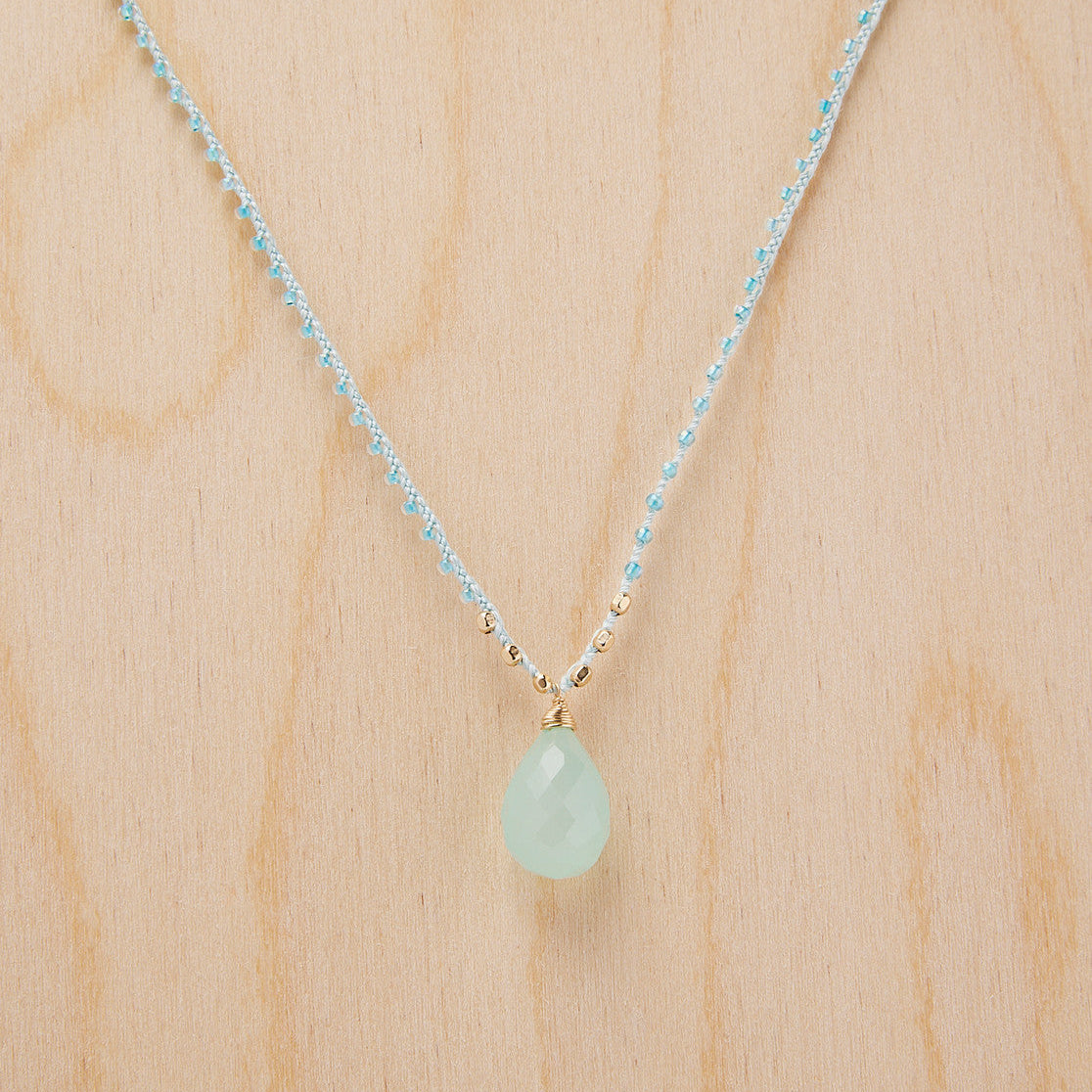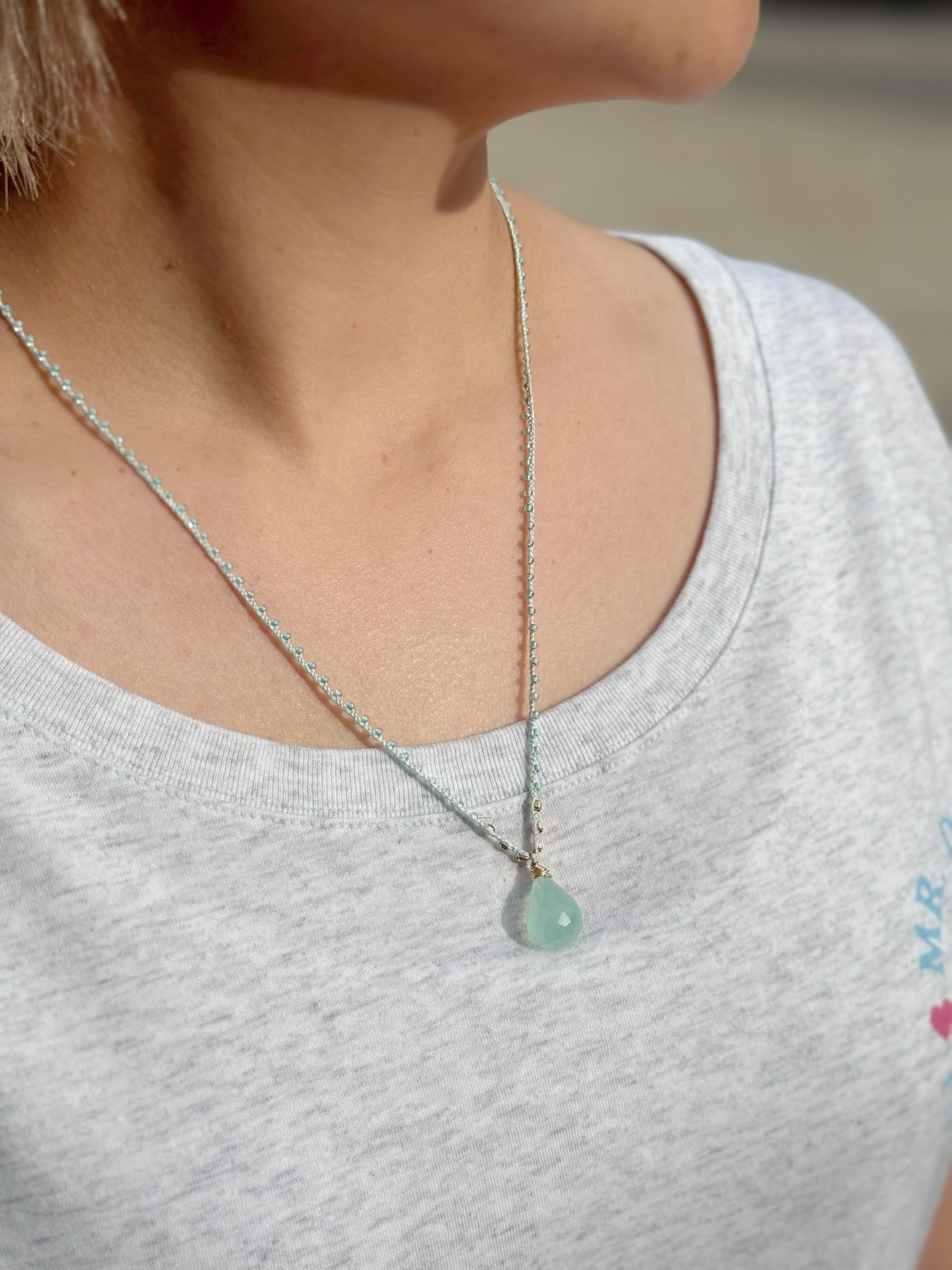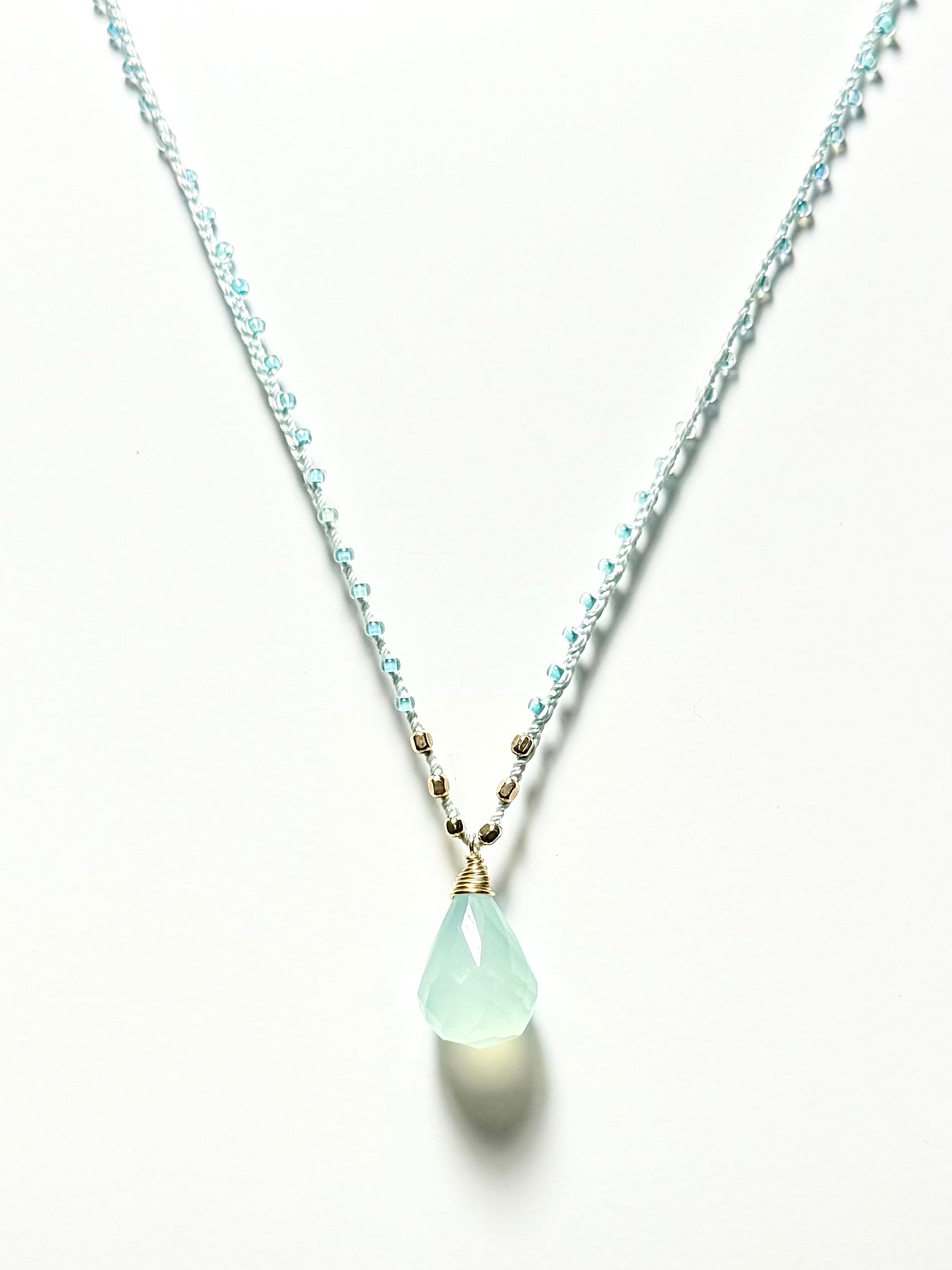 細かいビーズをシルク糸で編み込んだコードは通常バージョンより長めで、カットがかかったティアドロップアクアカルセドニーのトップも通常バージョンより大きめです。