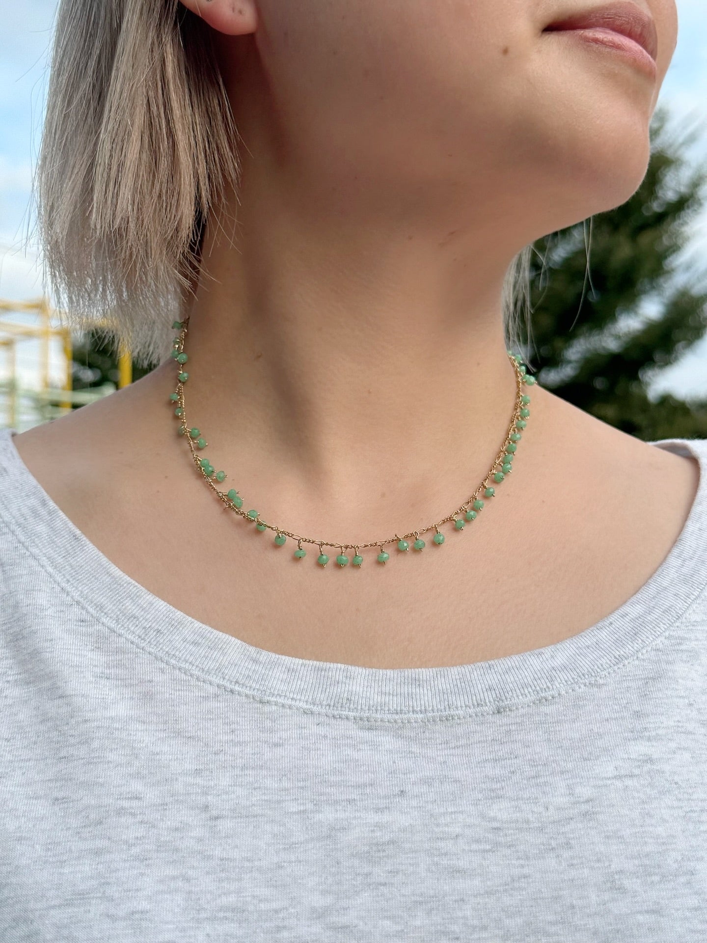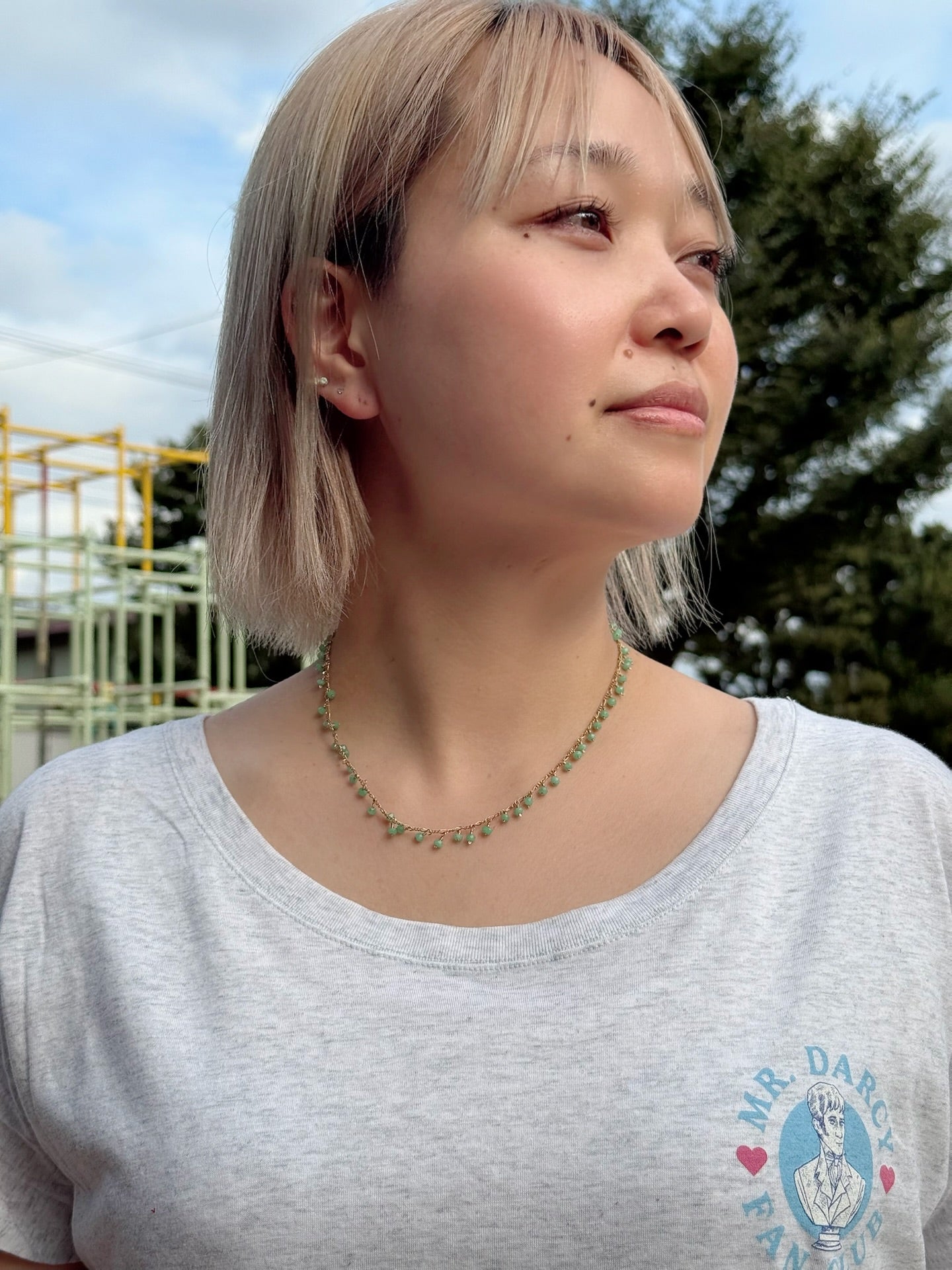 小さなドロップ型の天然石が首元に繊細に並び、動くたびにさりげなくきらめきます。