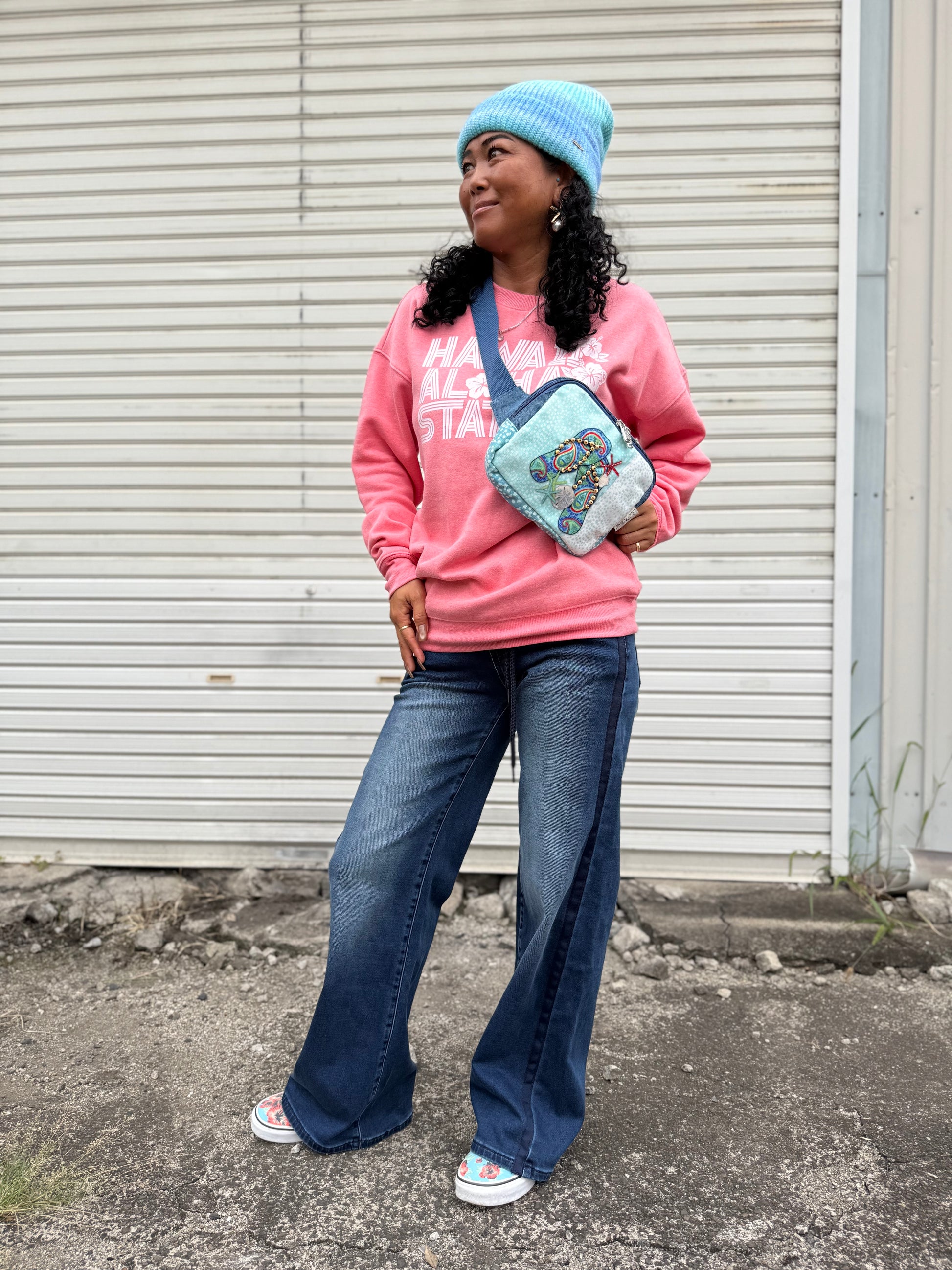 クルーネック、裏起毛、長袖、リラックスフィットフロント:Hawaii Aloha State グラフィックプリント