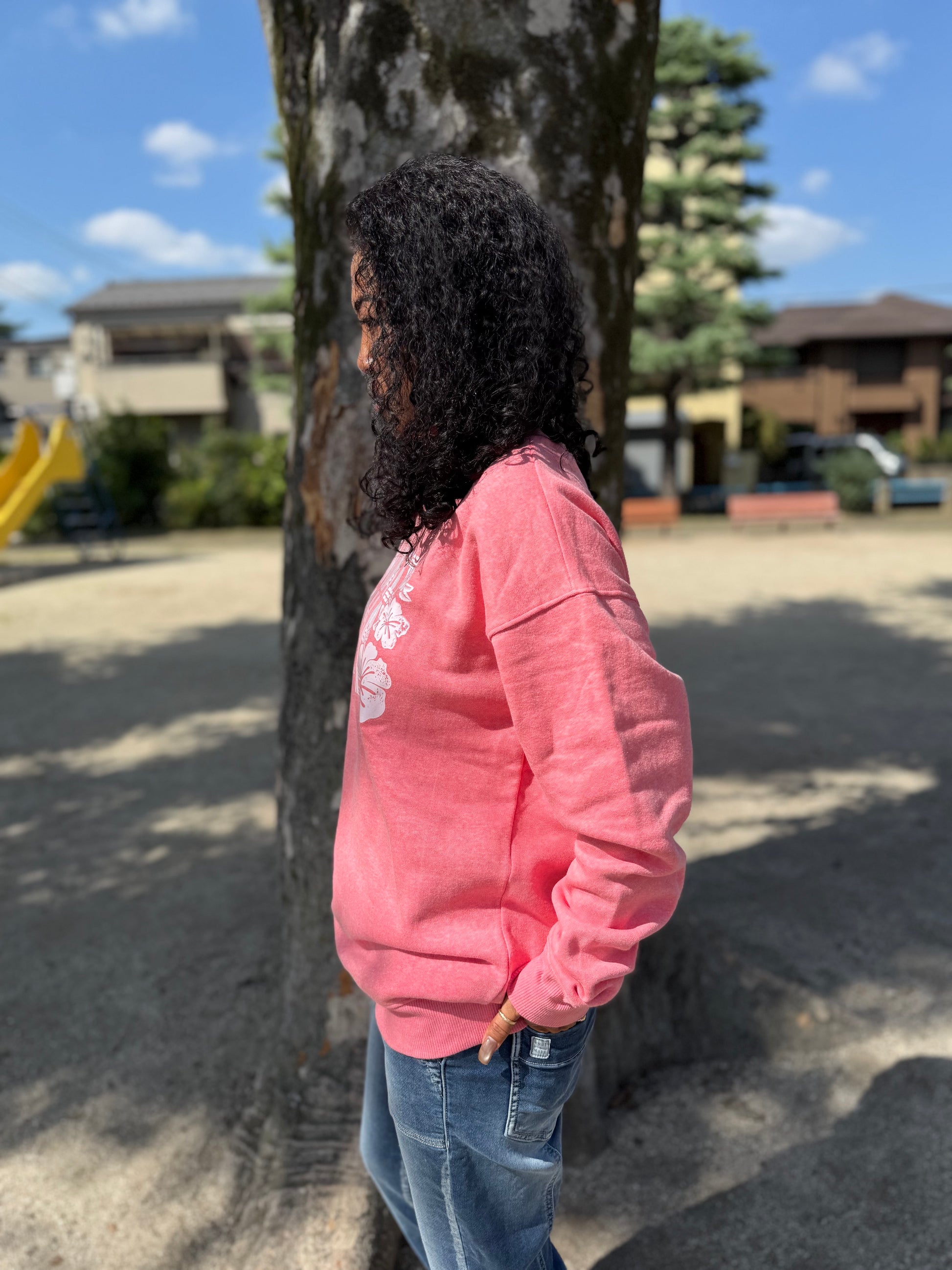 フロントのハイビスカスグラフィックがリゾートムードを演出し、デニムやショートパンツに合わせてカジュアルスタイルを華やかに仕上げます。