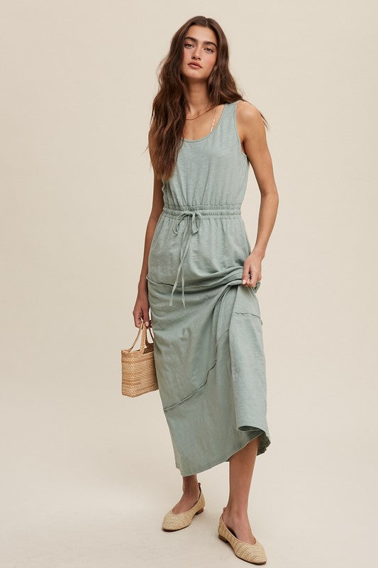 LAインポート「Listicle」リラックス感のあるジャージー素材のマキシワンピースです。スカートの斜めに入った切替がポイント。さり気ないシンプルなワンピースと小物遣いでおしゃれ感アップ!