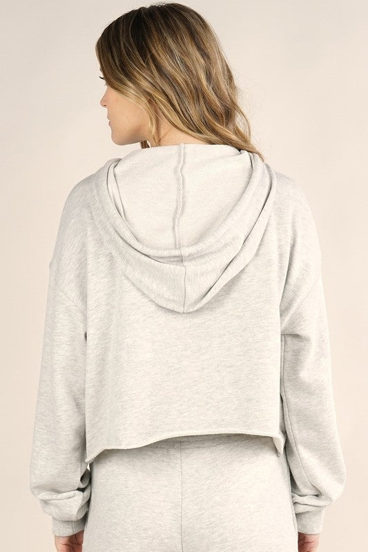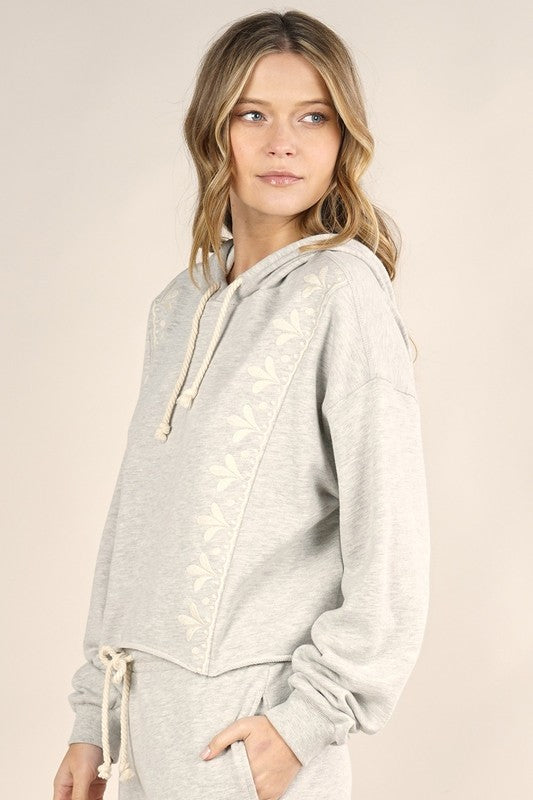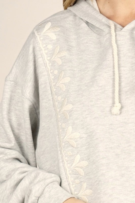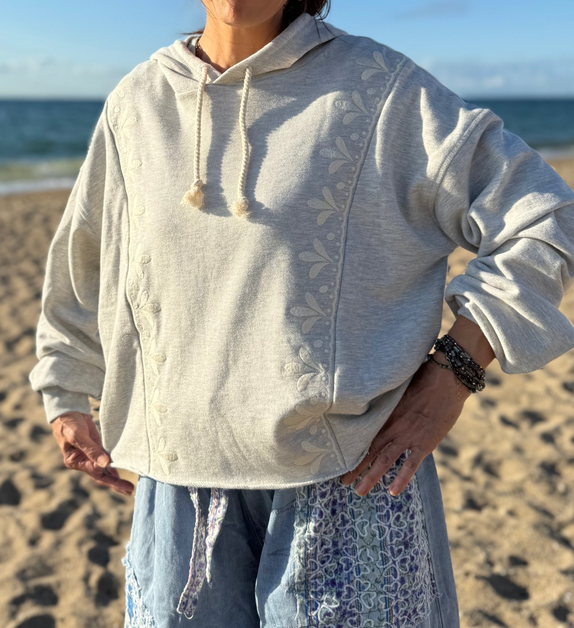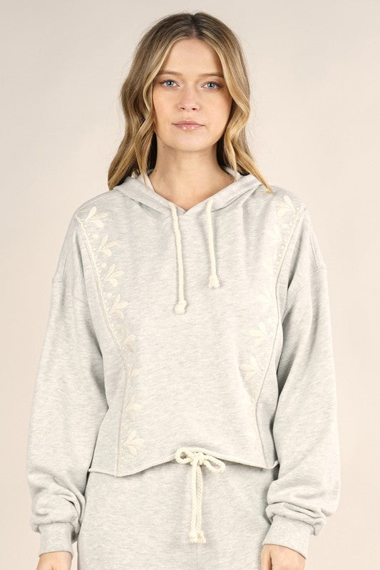 両脇の刺繍がポイントのフード付きプルオーバーです。パンツやスカートと合わせた時もバランスの良いショート丈。デイリーに使いやすい一枚です。