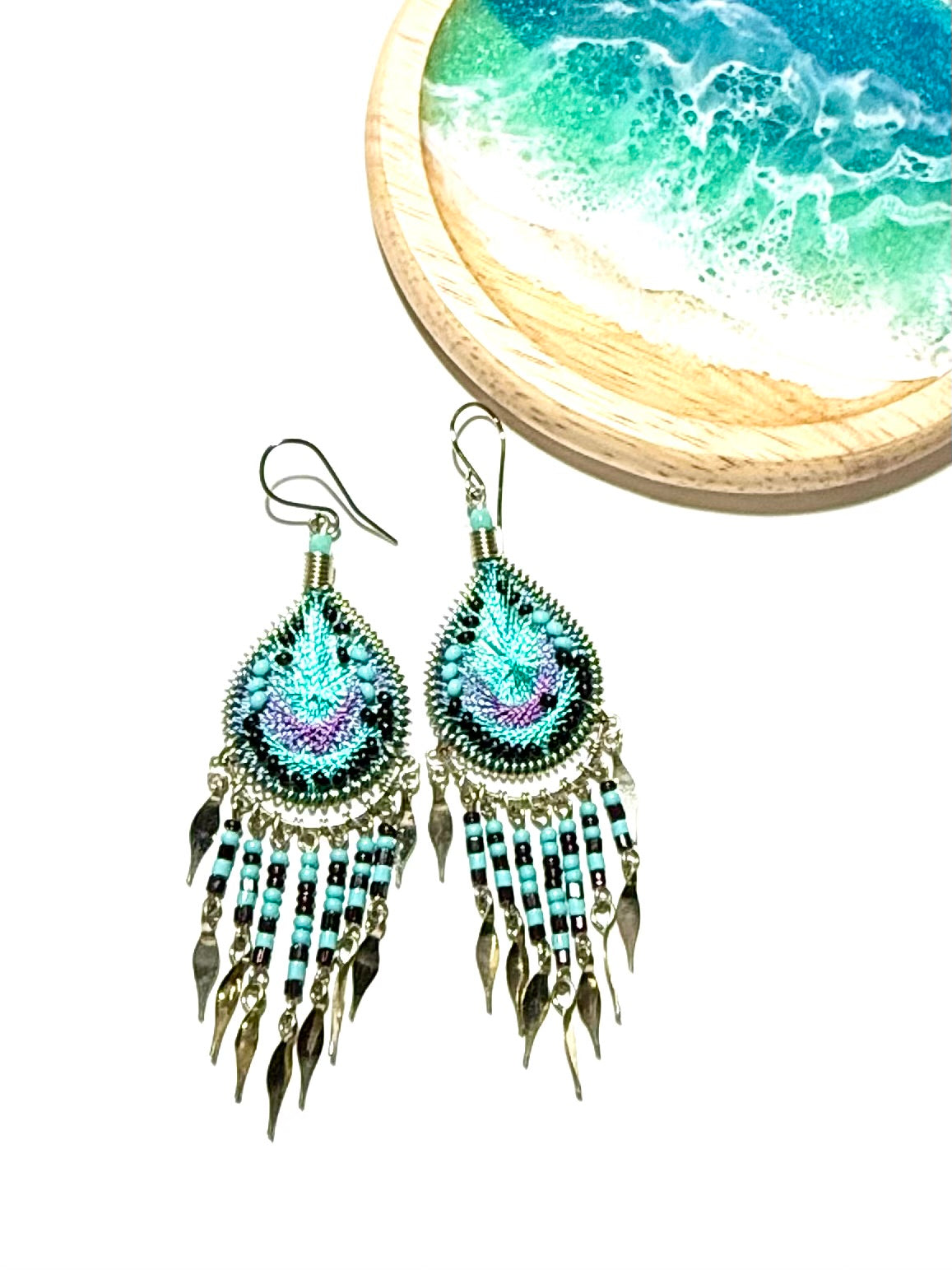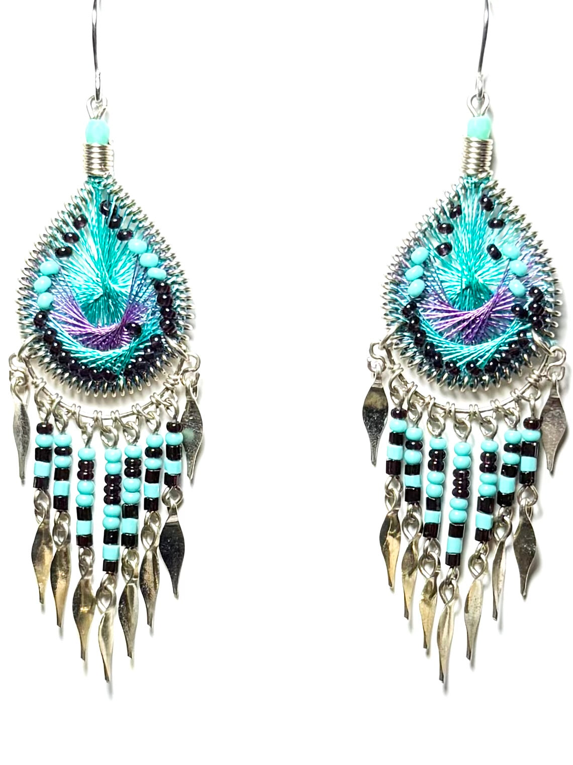 アメリカのハンドメイドジュエリー”マチュピチュジュエリー”のグラデーションがきれいなマーメイドシリーズピアス。様々な色の糸が細かくかかった中にビーズが編み込まれ、すそがシャラシャラと揺れるダングルピアス。ペルーの職人さんの手でひとつひとつ丁寧に作られています。