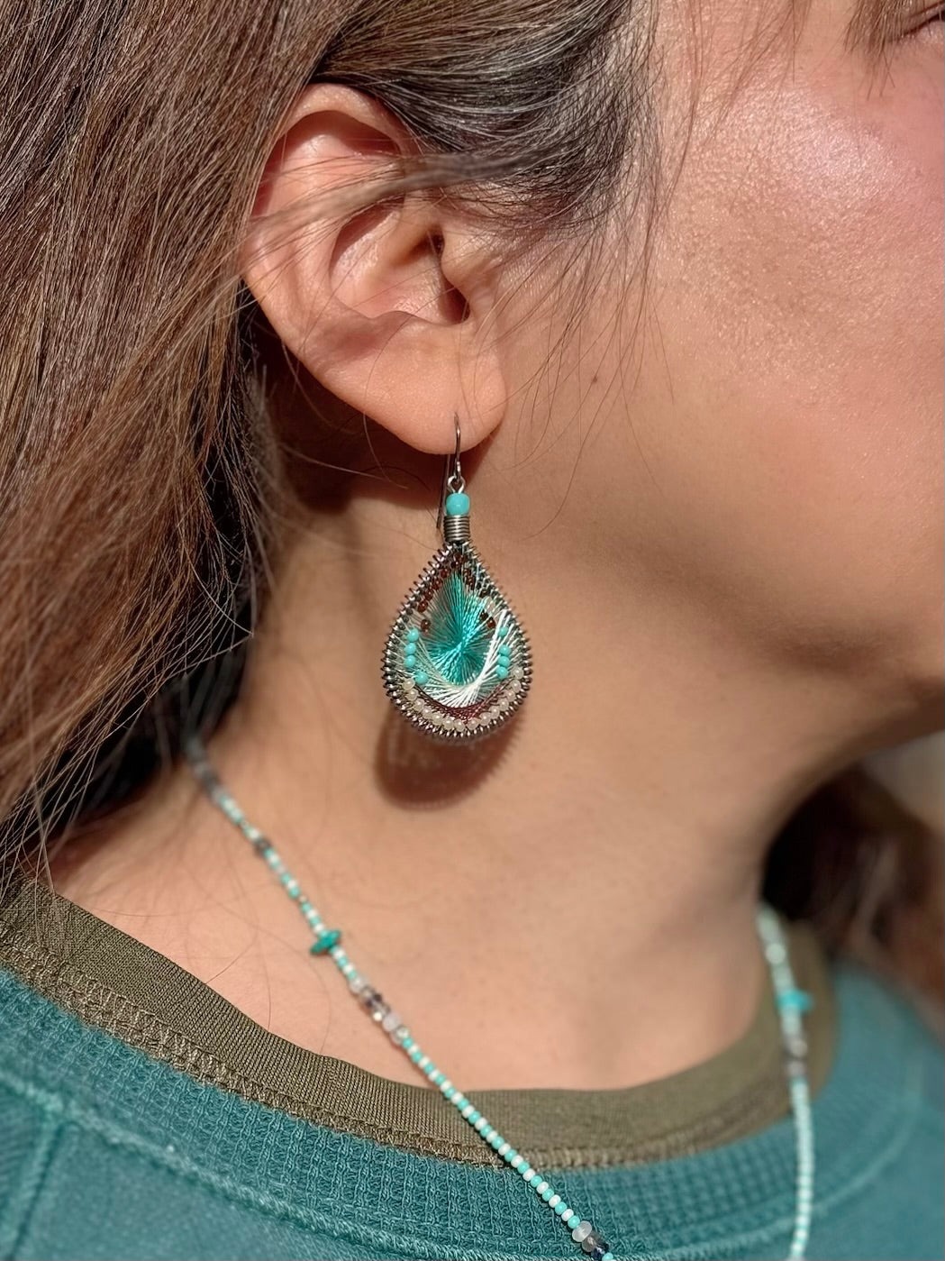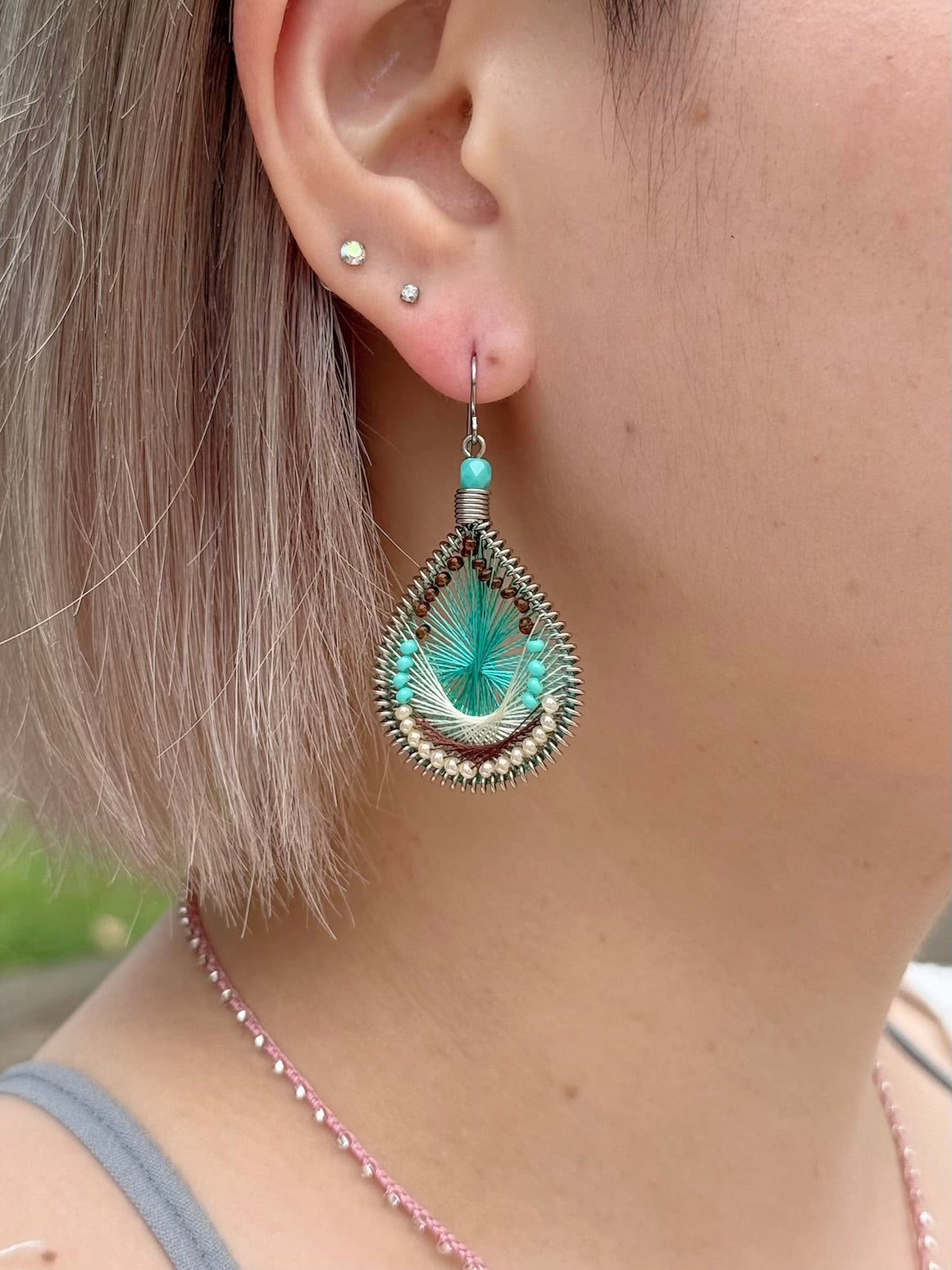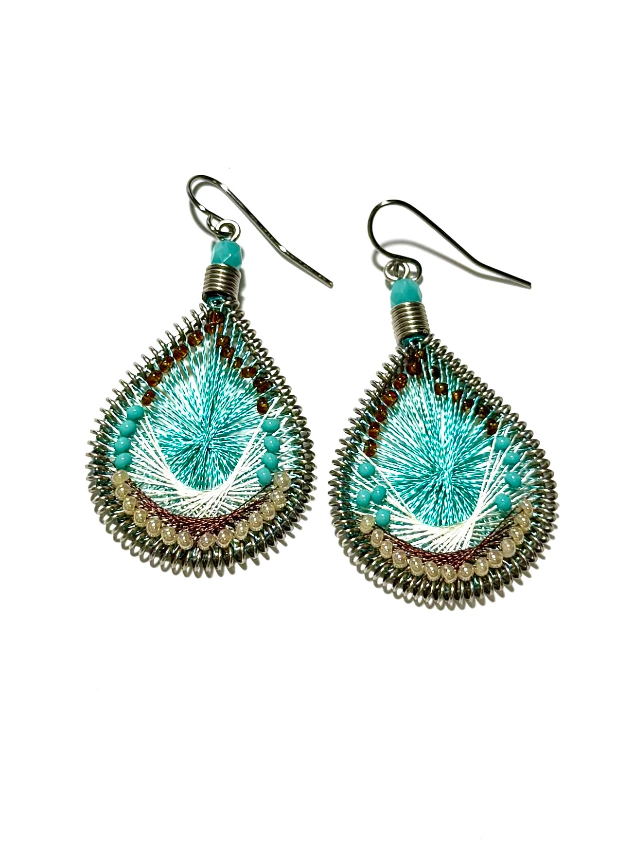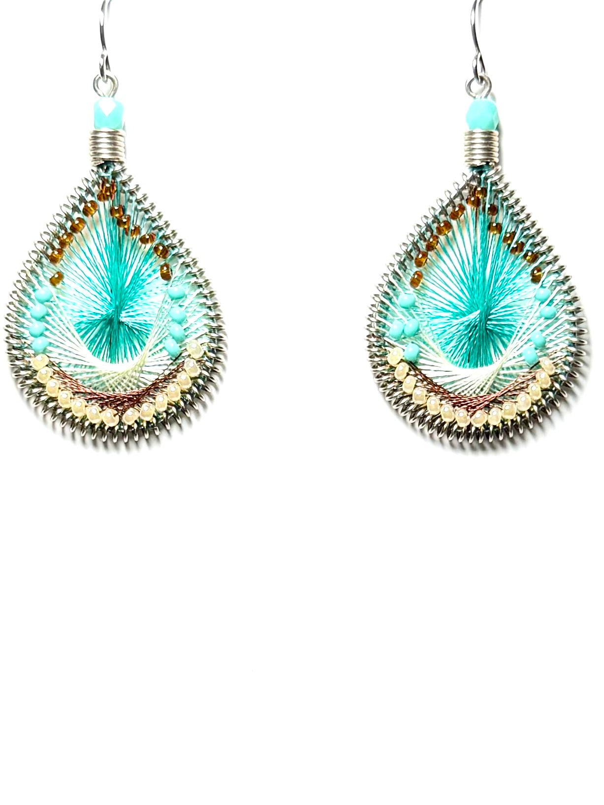 アメリカのハンドメイドジュエリー”マチュピチュジュエリー”のグラデーションがきれいなマーメイドシリーズピアス。様々な色の糸が細かくかかった中にビーズが編み込まれています。ペルーの職人さんの手でひとつひとつ丁寧に作られています。