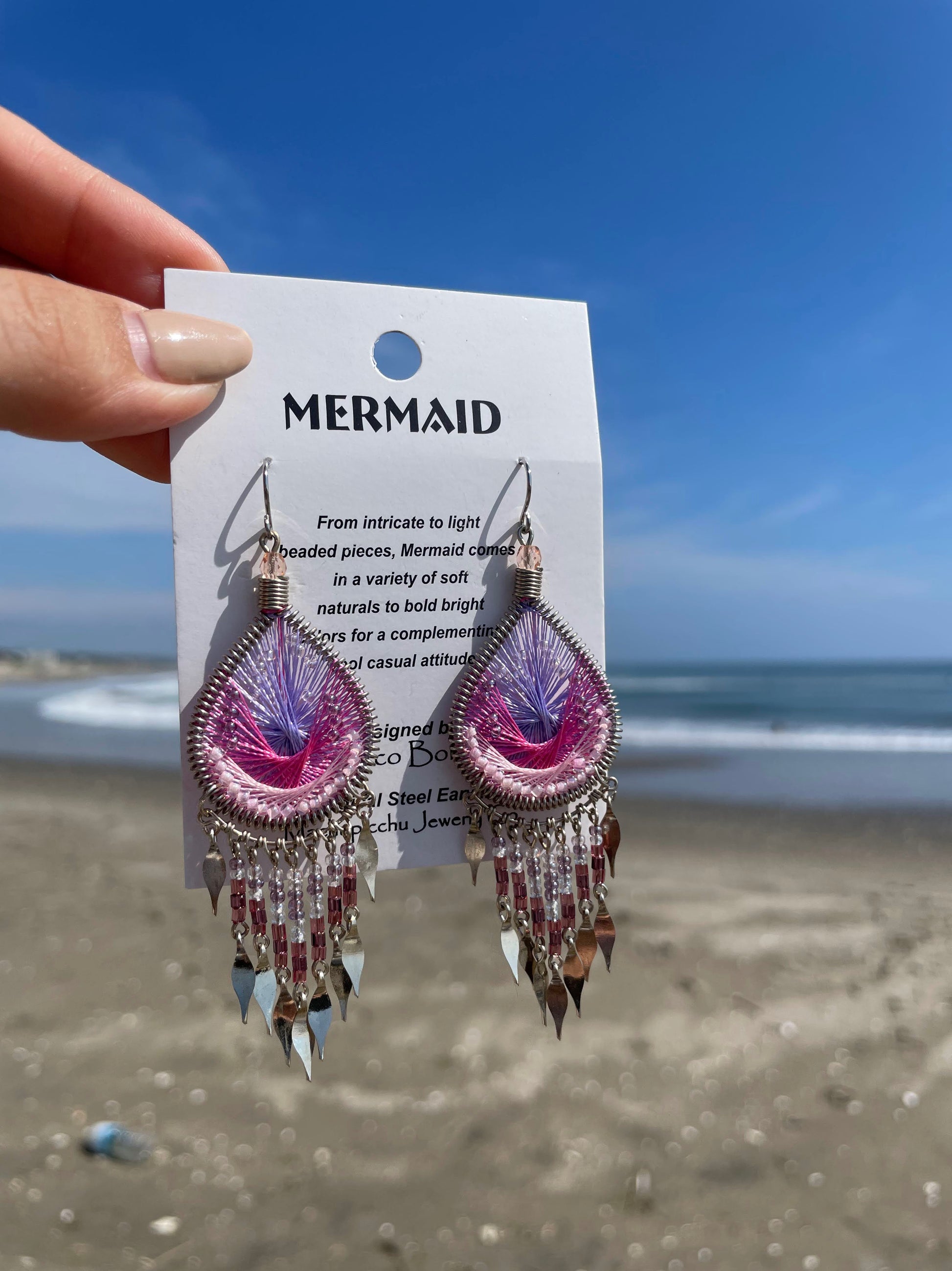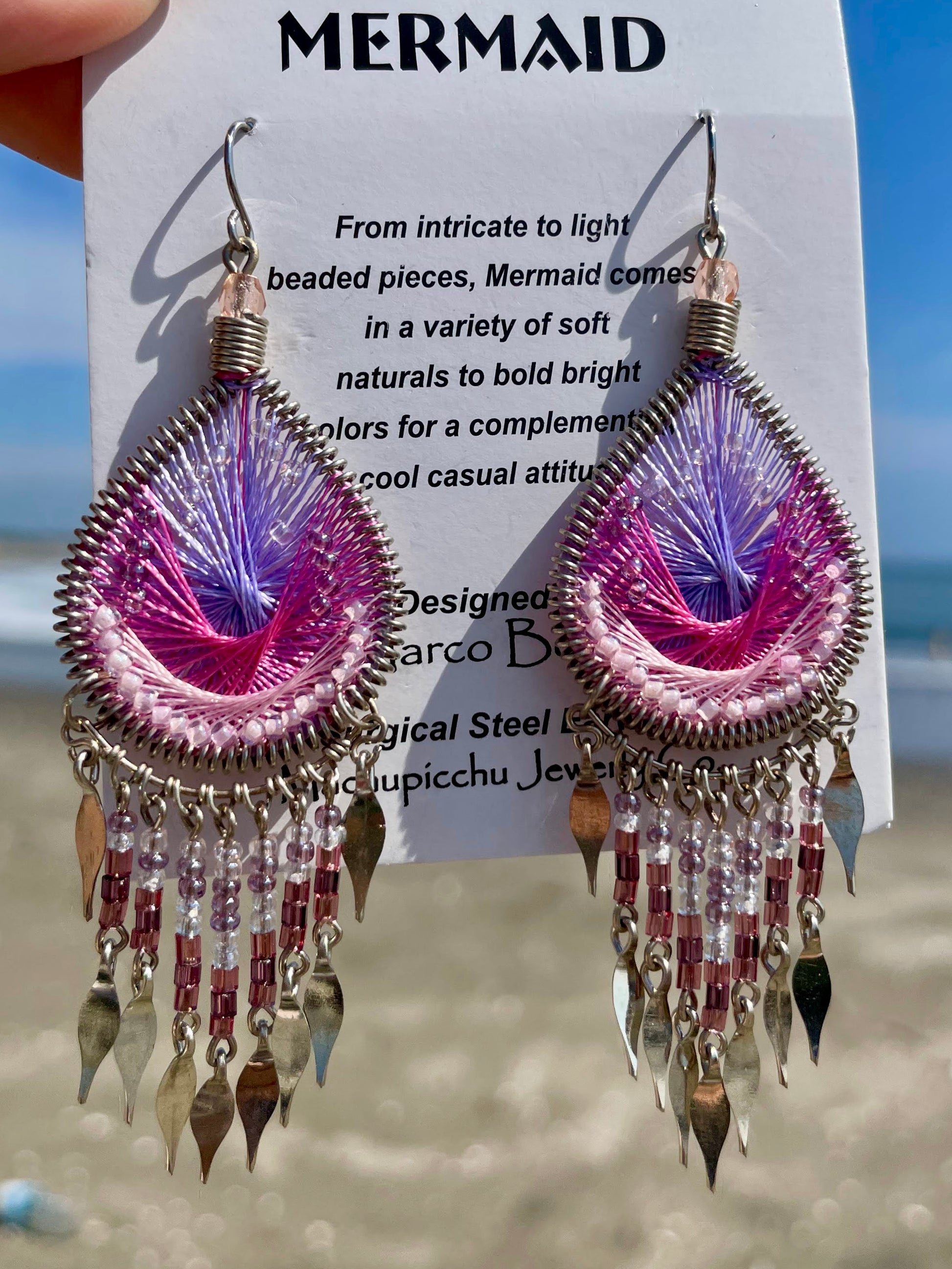 アメリカのハンドメイドジュエリー”マチュピチュジュエリー”のグラデーションがきれいなマーメイドシリーズピアス。様々な色の糸が細かくかかった中にビーズが編み込まれ、すそがシャラシャラと揺れるダングルピアス。ペルーの職人さんの手でひとつひとつ丁寧に作られています。