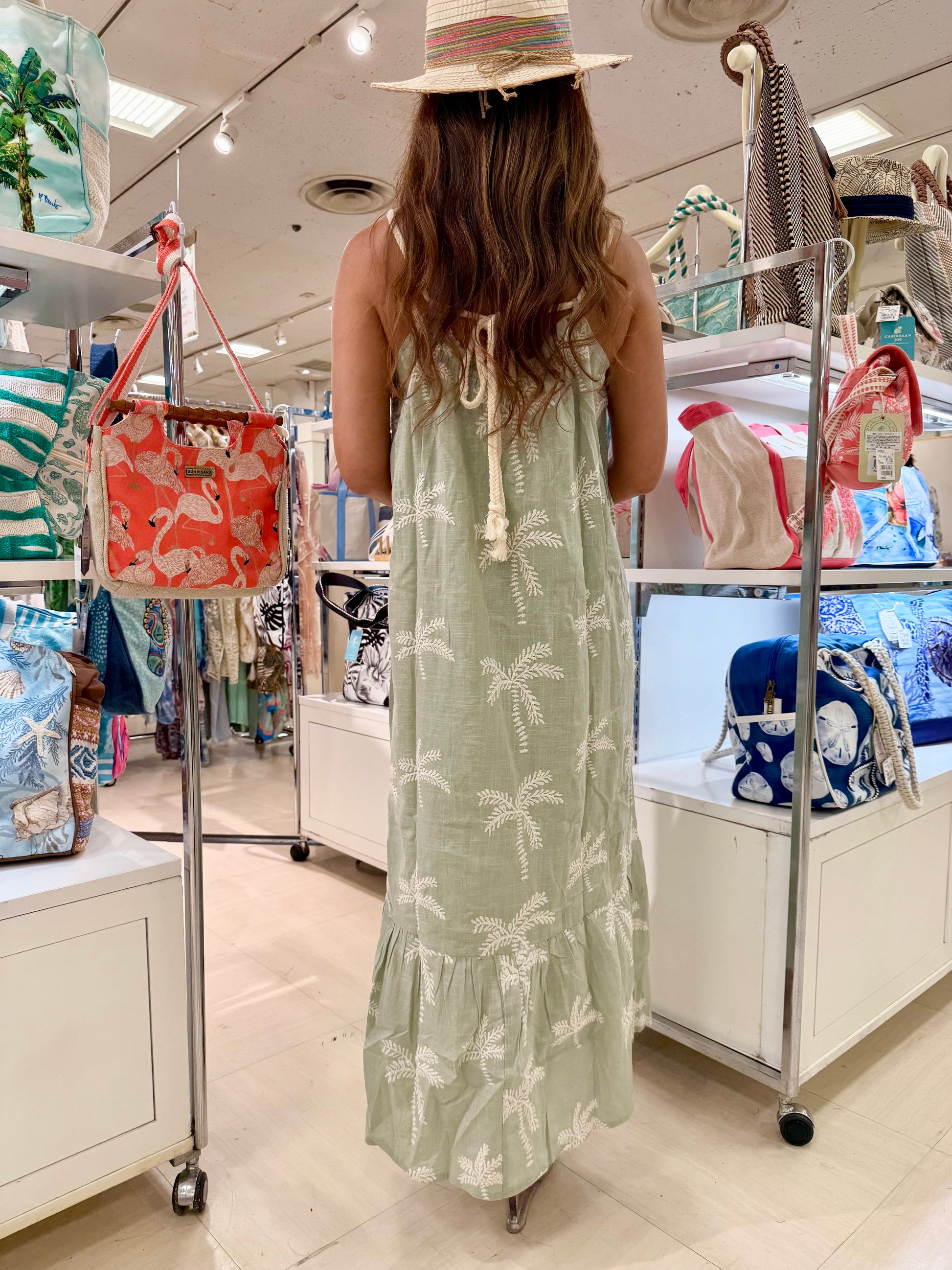 ナチュラルな風合いのコットン素材を使用したマキシワンピース。さらっとした肌ざわりで、暑い季節にも快適に着られる一枚です。淡いカラーにヤシの木柄の刺繍をあしらったデザインは、夏らしく爽やかな印象。裾のティアード切り替えがほどよい動きをプラスします。リゾートや日常のカジュアルスタイルにぴったり。