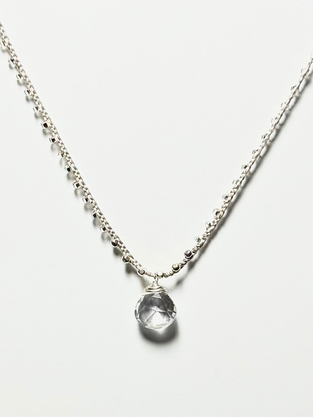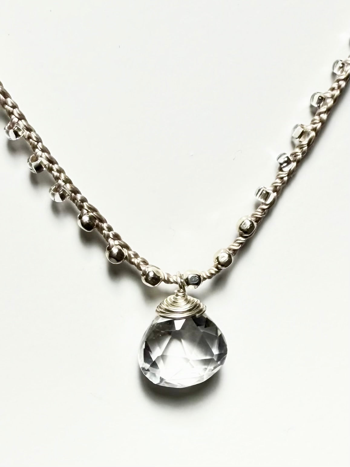 透明感のある天然クォーツと、上品なライトグレーのシルクコードを組み合わせた軽やかなデザイン。SV925パーツを使用し、デイリーにもきれいめにも合わせやすい一本です。