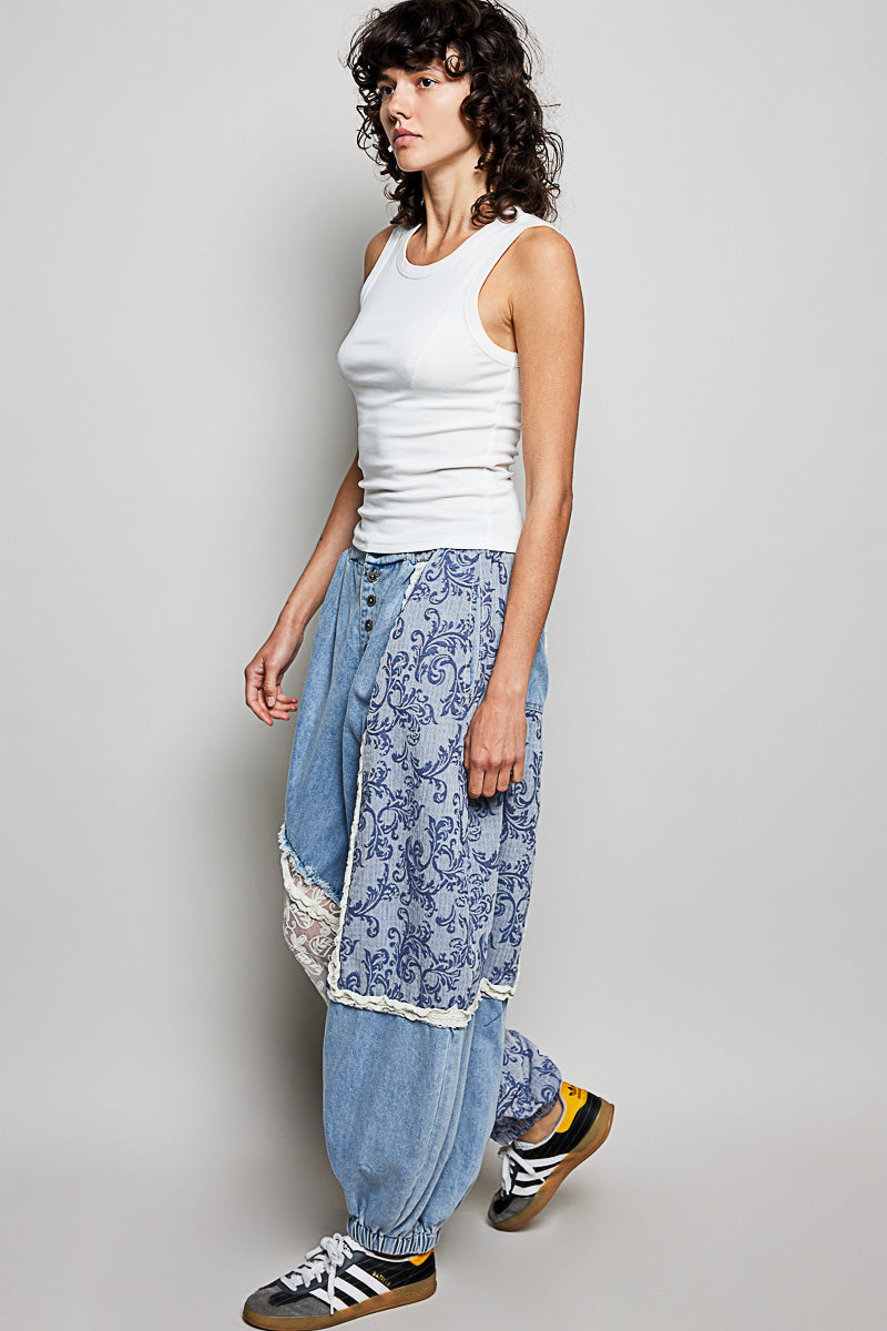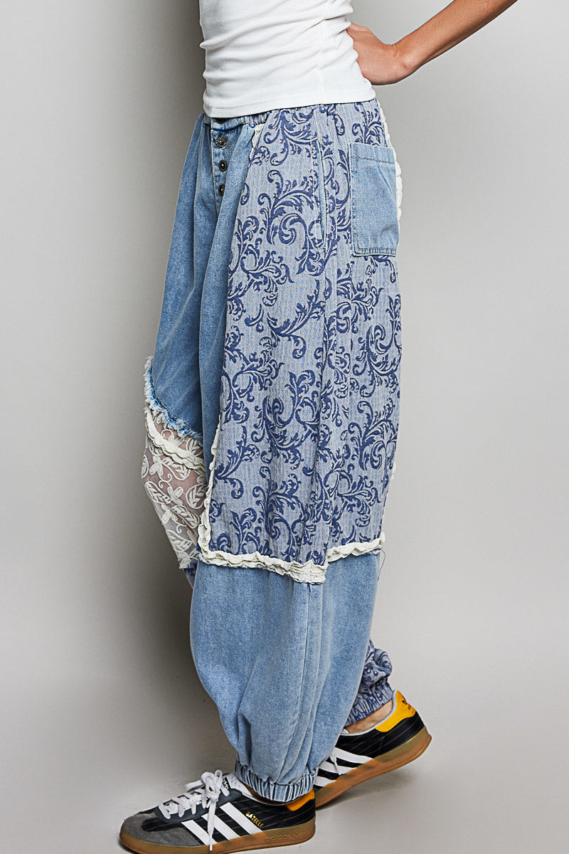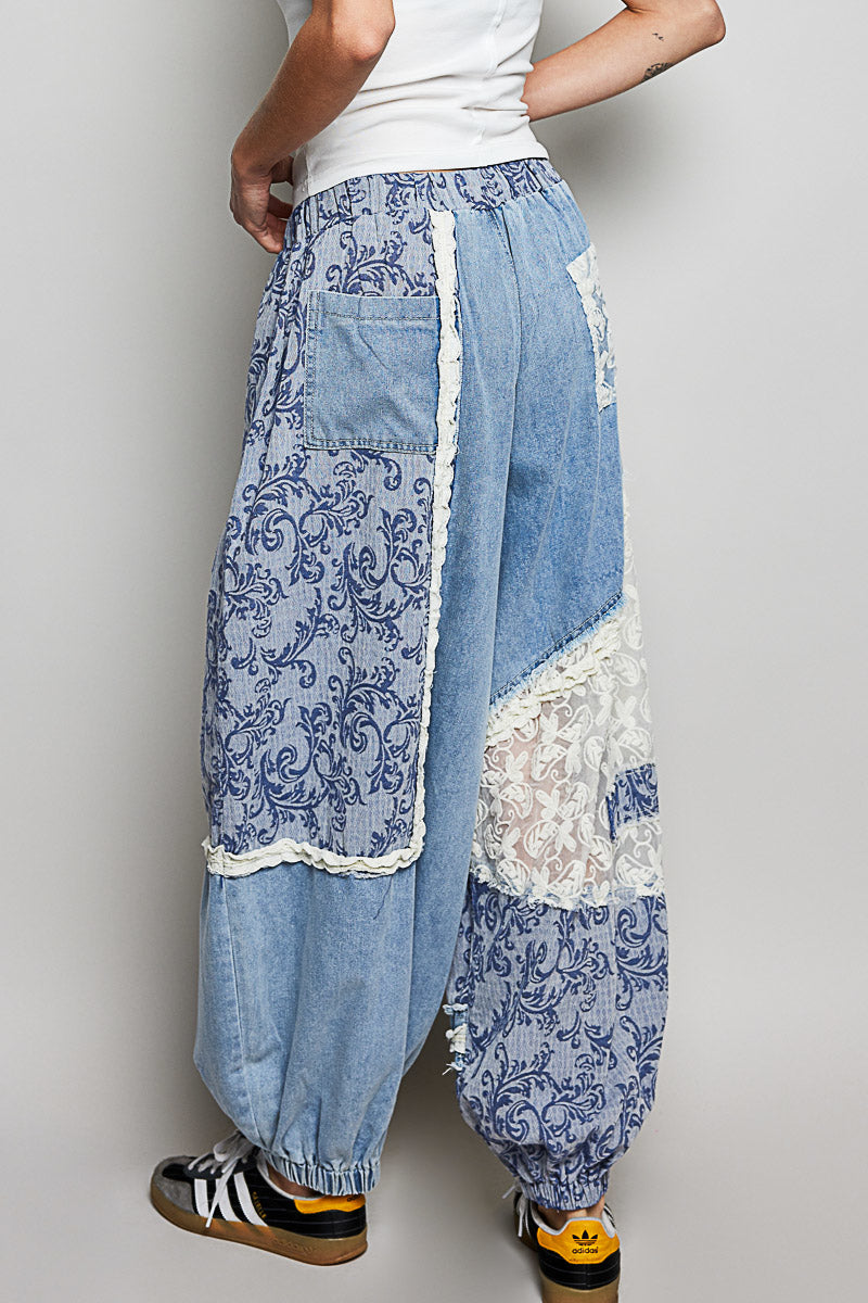POL クロシェ&レース切替 デニムジョガーパンツ