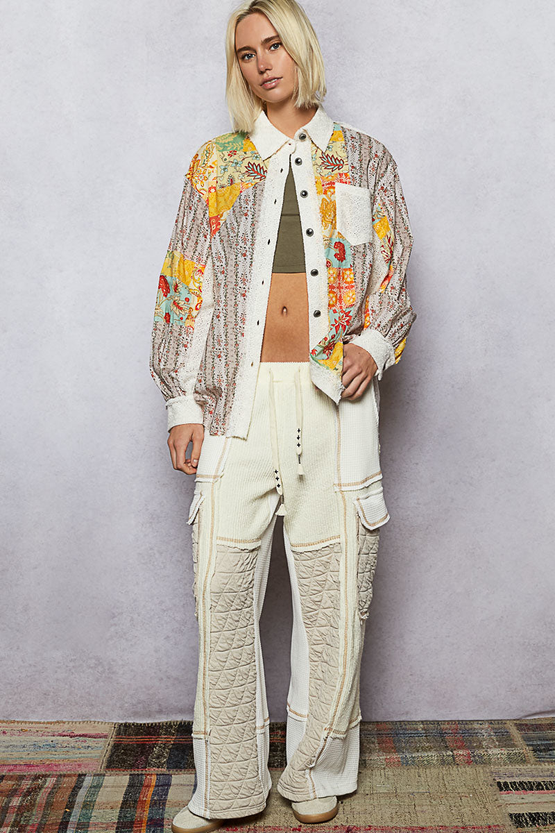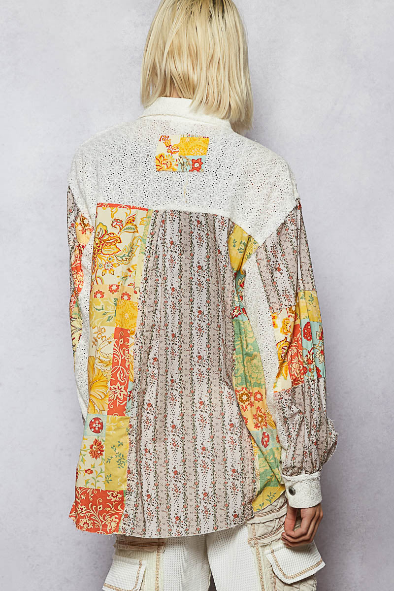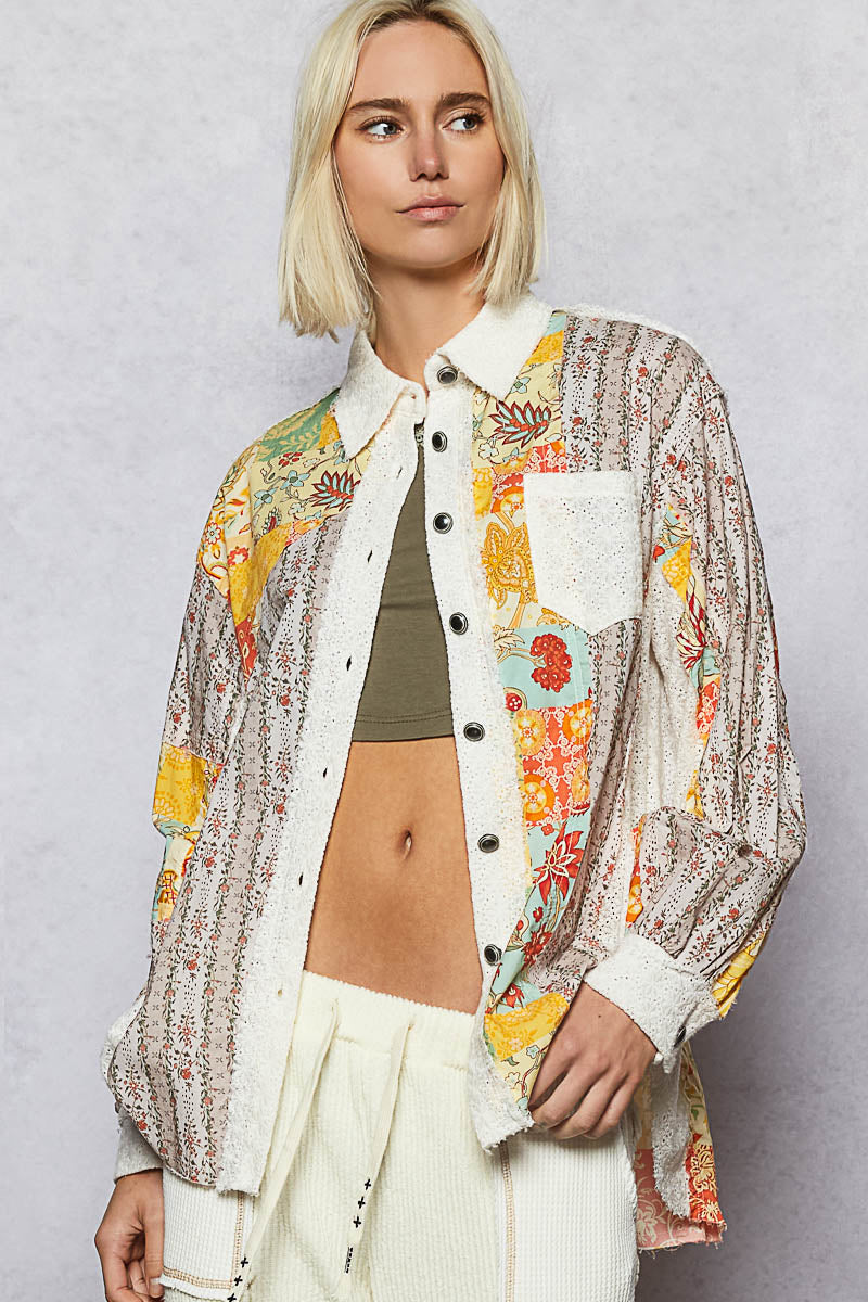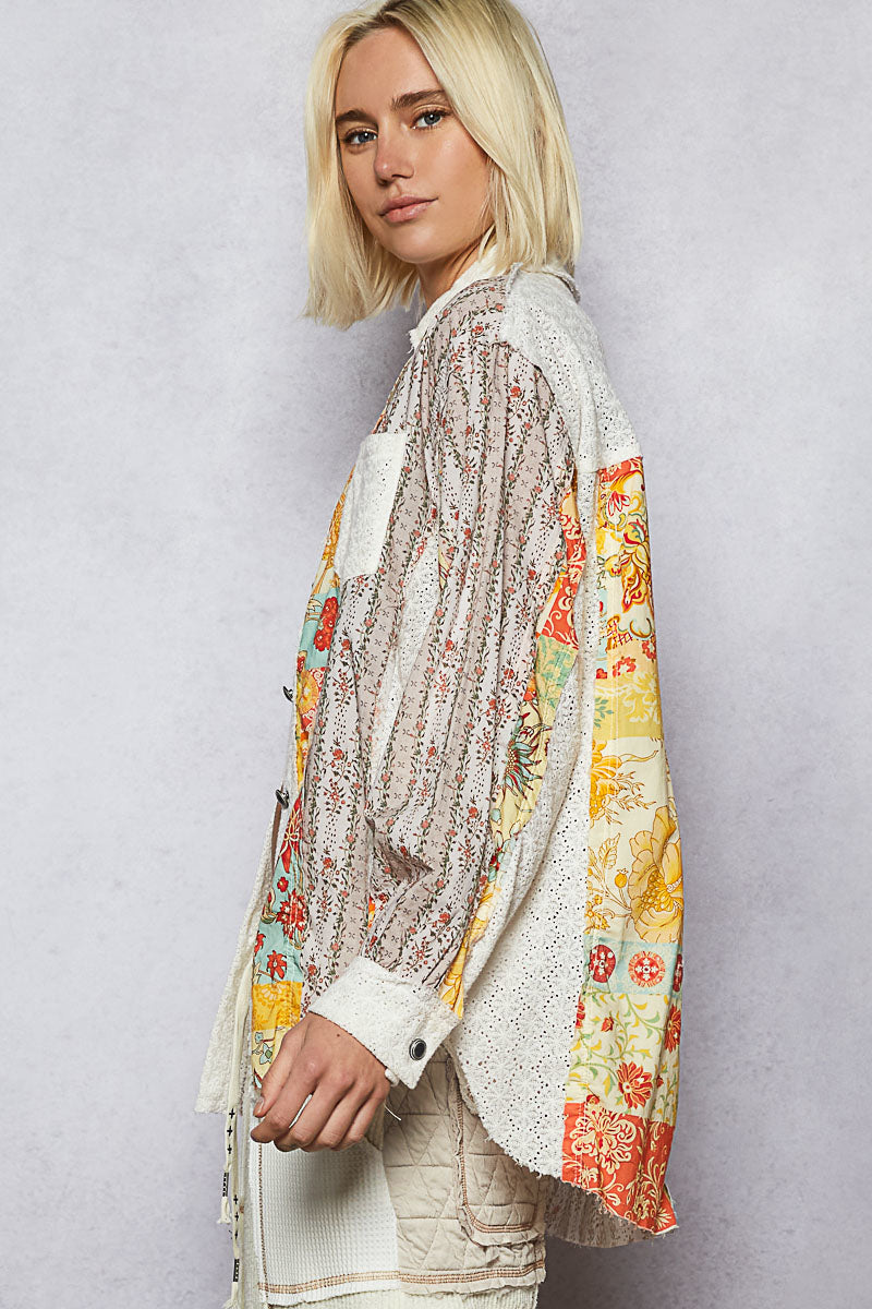LAインポート「POL」華やかなフラワープリント生地にレース切り替えを組み合わせた、ルーズフィットの長袖シャツ。ゆったりシルエットでラフに羽織るだけで抜け感のあるコーデに。