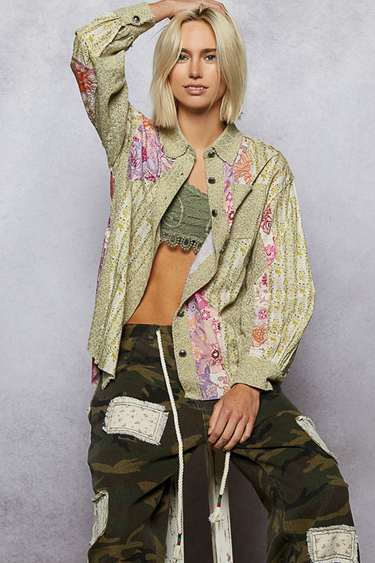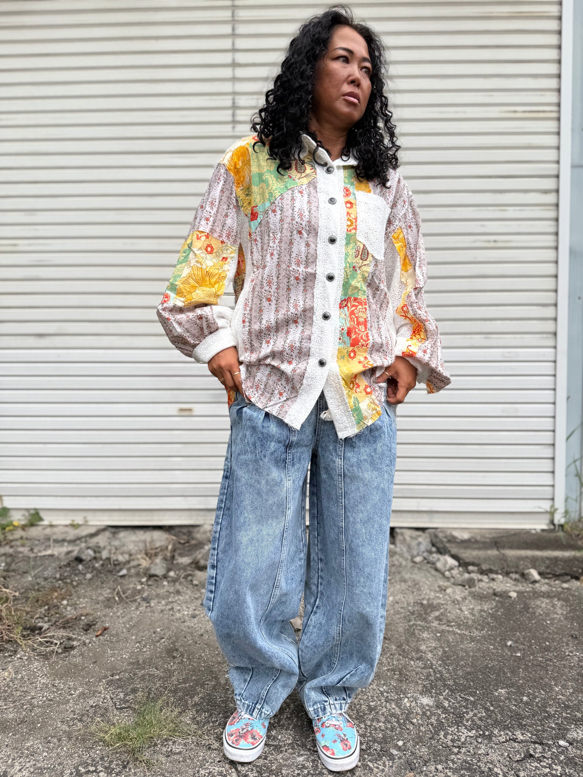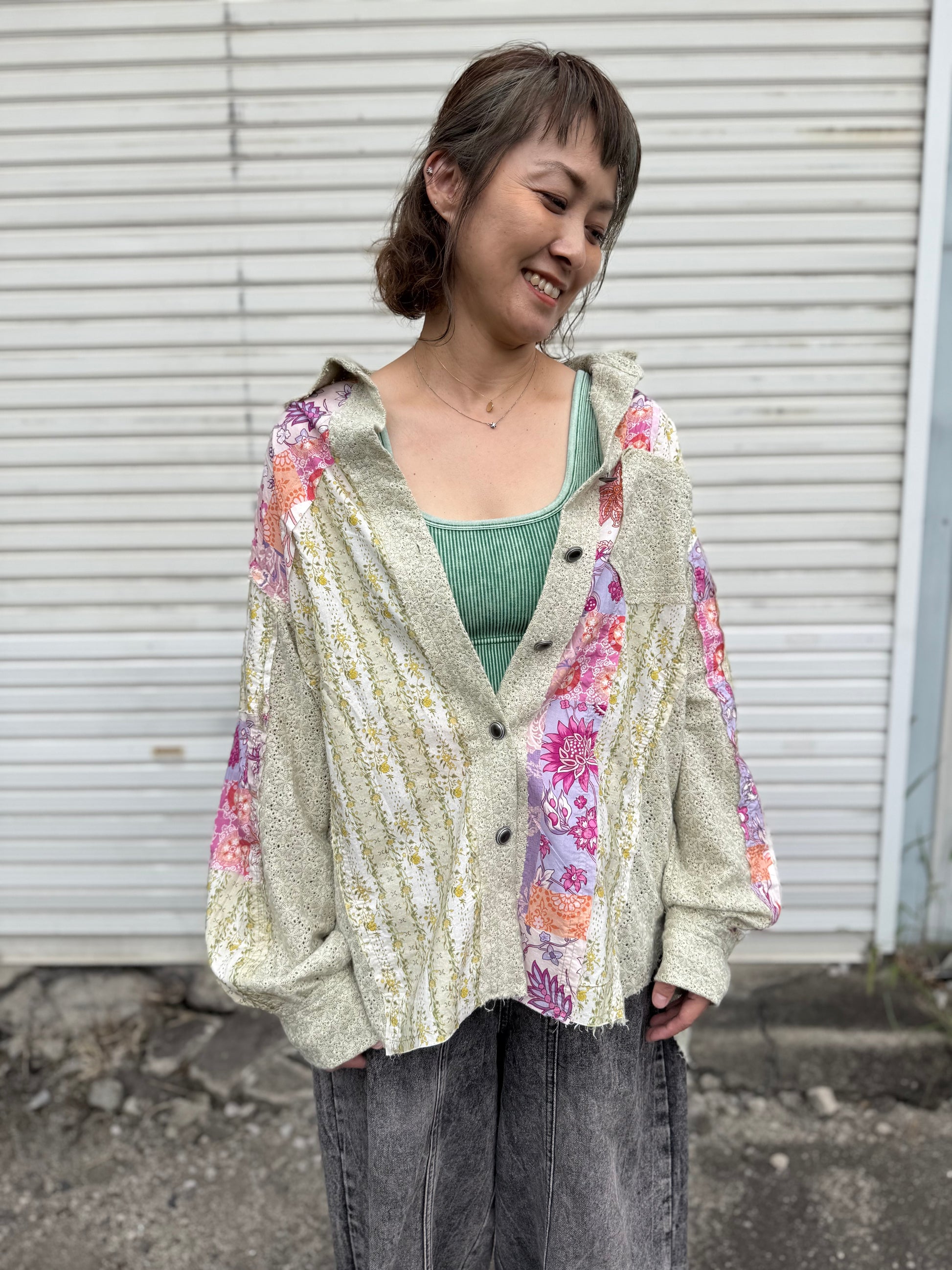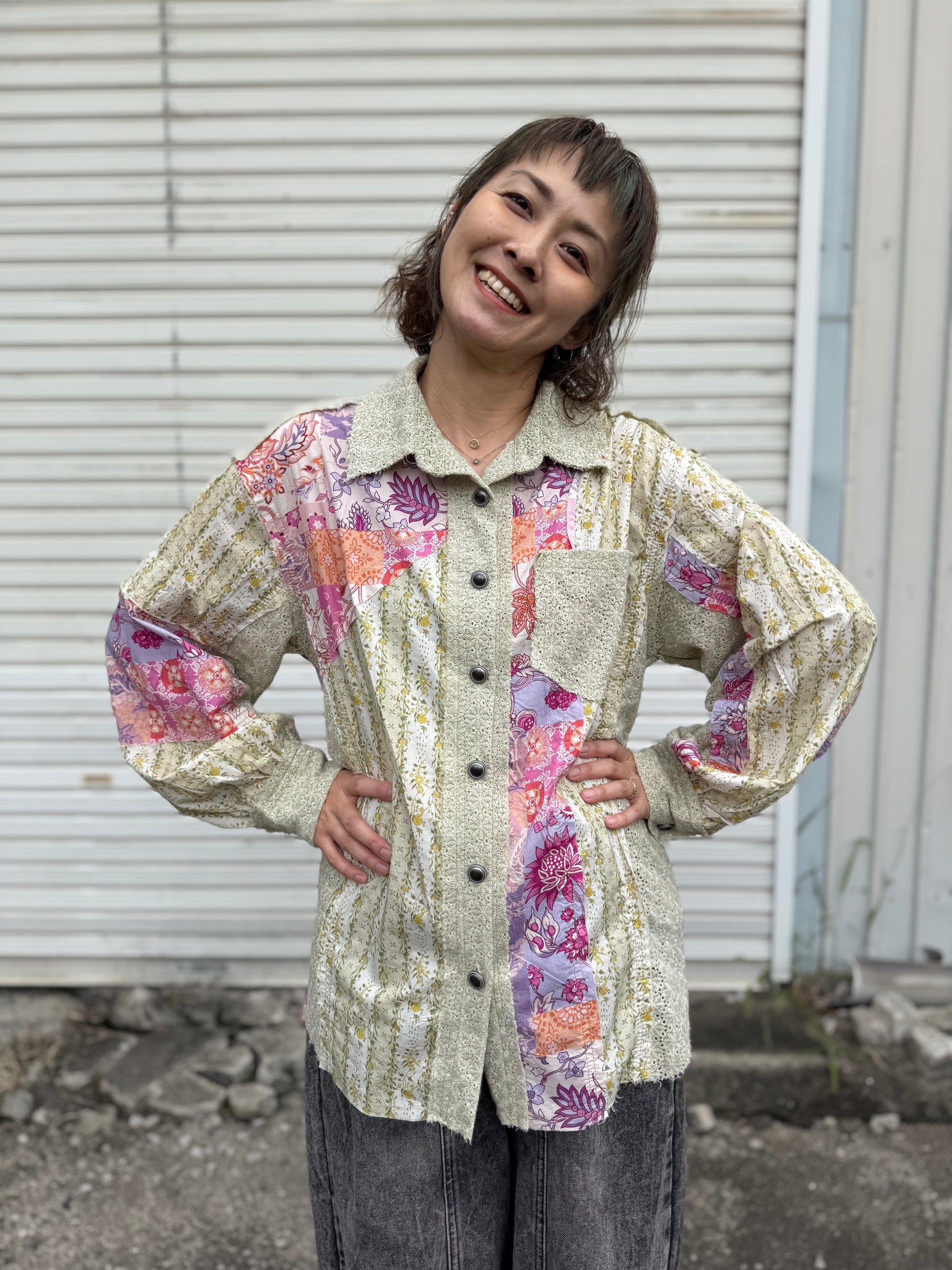 LAインポート「POL」華やかなフラワープリント生地にレース切り替えを組み合わせた、ルーズフィットの長袖シャツ。ゆったりシルエットでラフに羽織るだけで抜け感のあるコーデに。