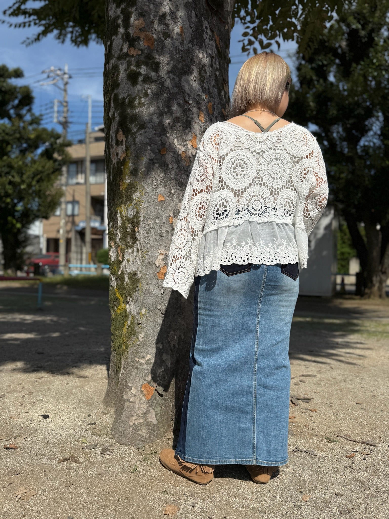 LAインポート「POL」フラワーモチーフのクロシェ編みとアイレット刺繍を組み合わせた、8分袖トップス。透け感のある編み模様が涼しげで、フェミニンな雰囲気を演出します。裾にあしらったスカラップレースがポイントで、デニムやスカートに合わせてナチュラルに着こなせます。