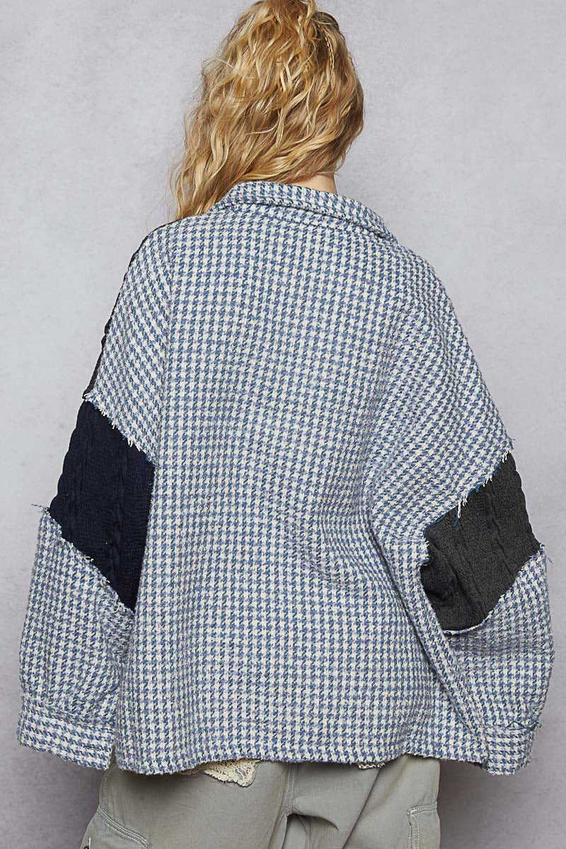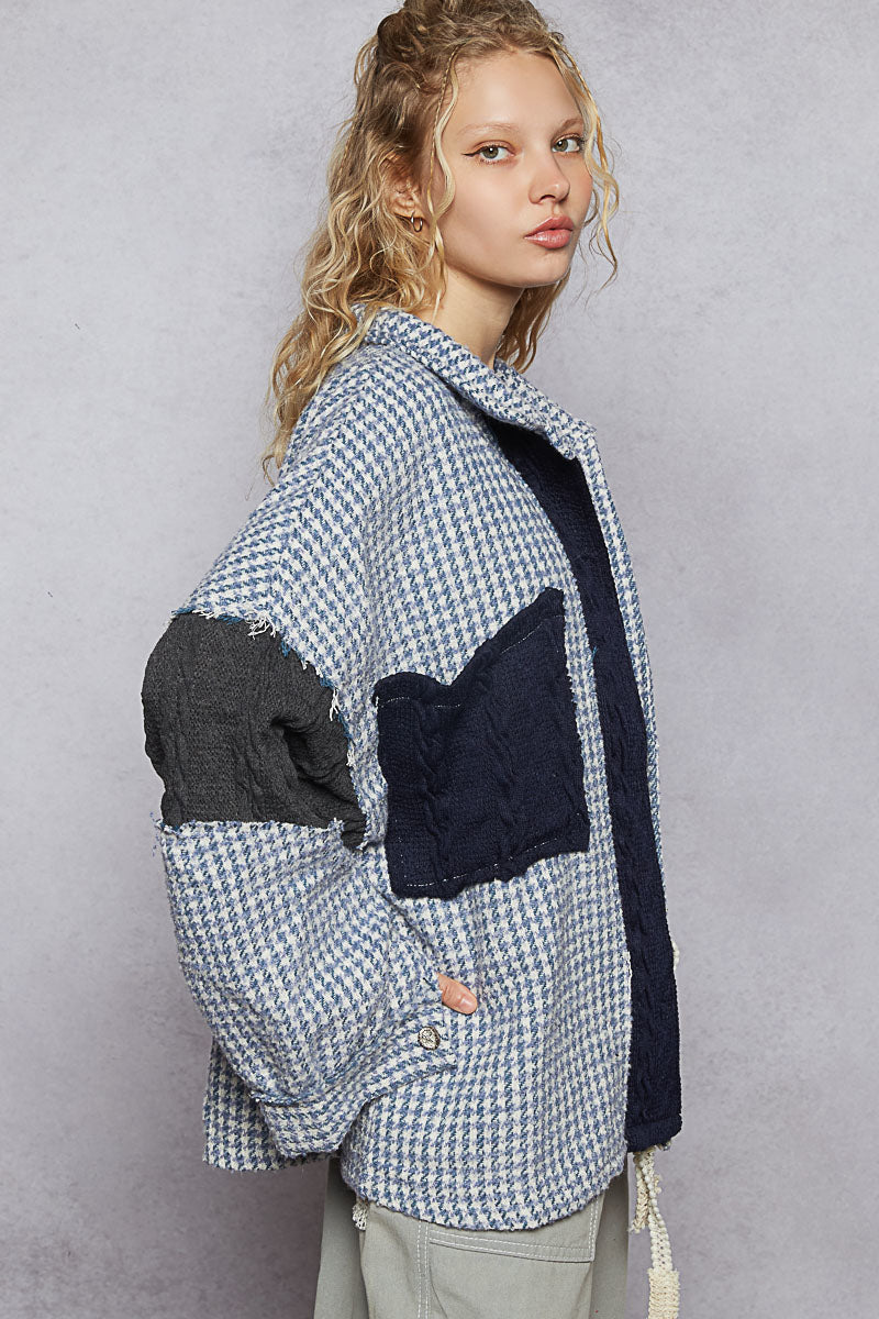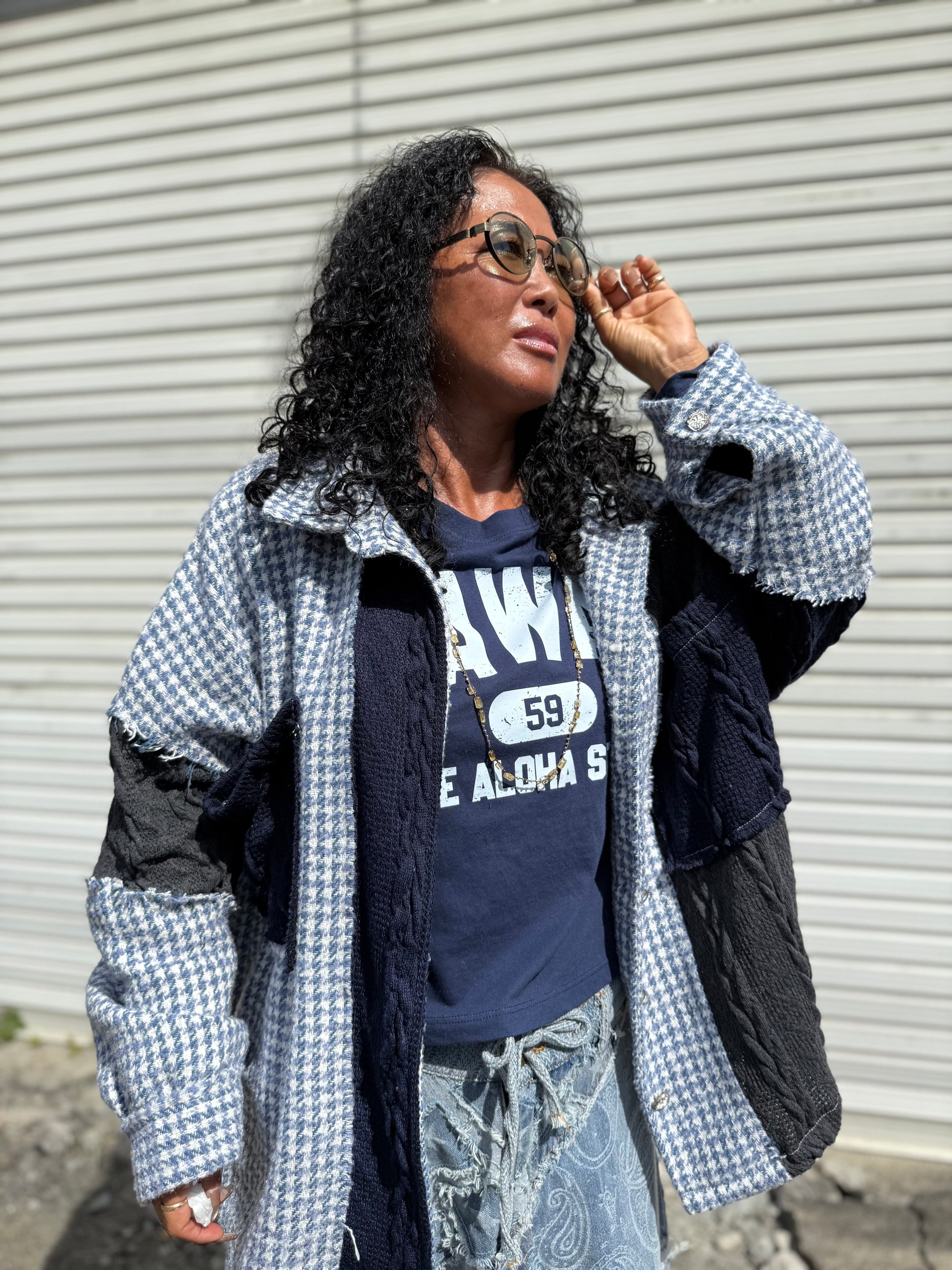 LAインポート「POL」ざっくりとした千鳥格子の織り生地に、ケーブルニット生地をアクセントにしたパッチワーク仕立てのルーズフィットオーバーサイズジャケット。異素材の切り替えがポイントで、羽織るだけでこなれ感のあるスタイルに。カジュアルからストリートまで幅広く活躍します。