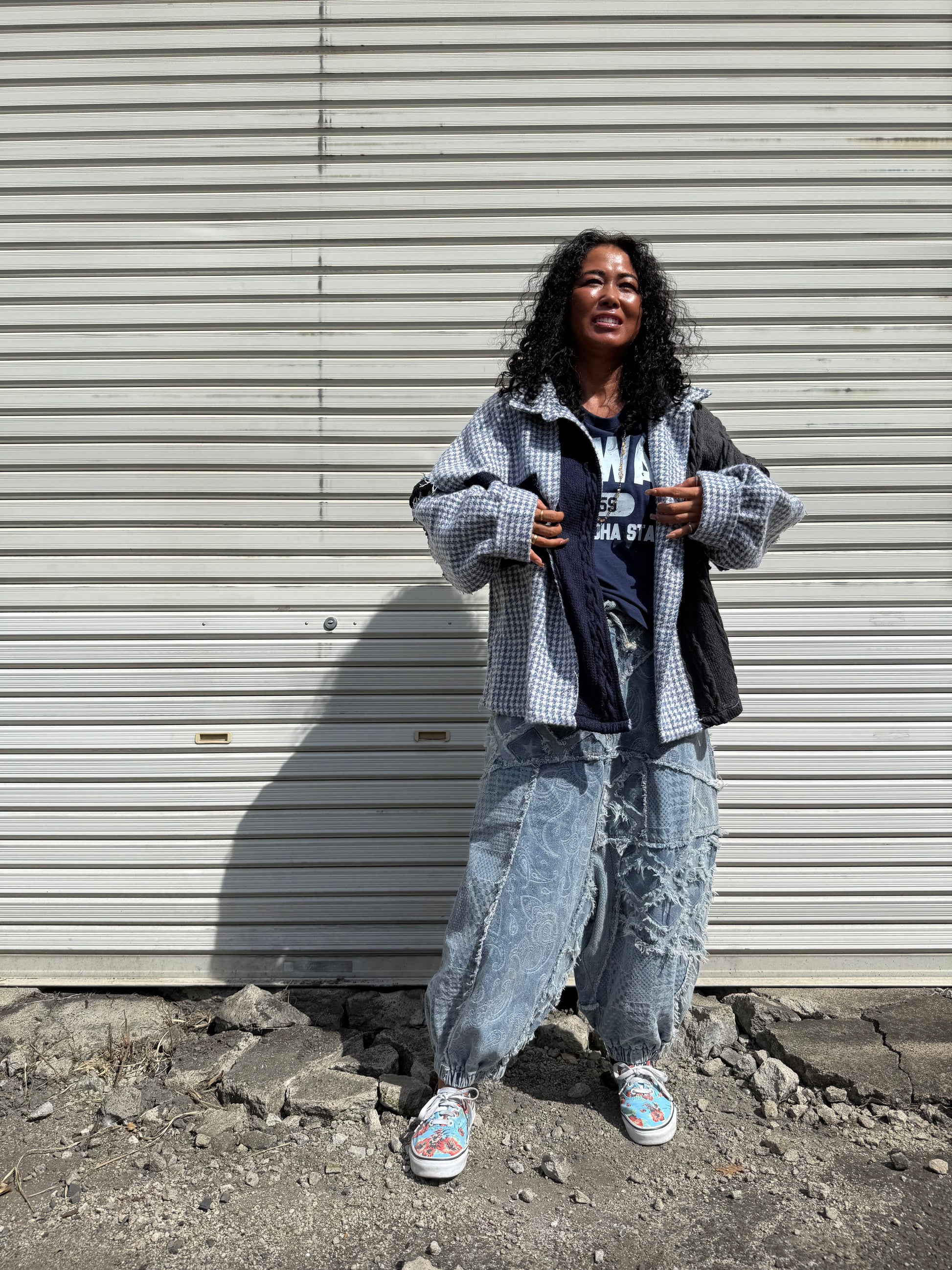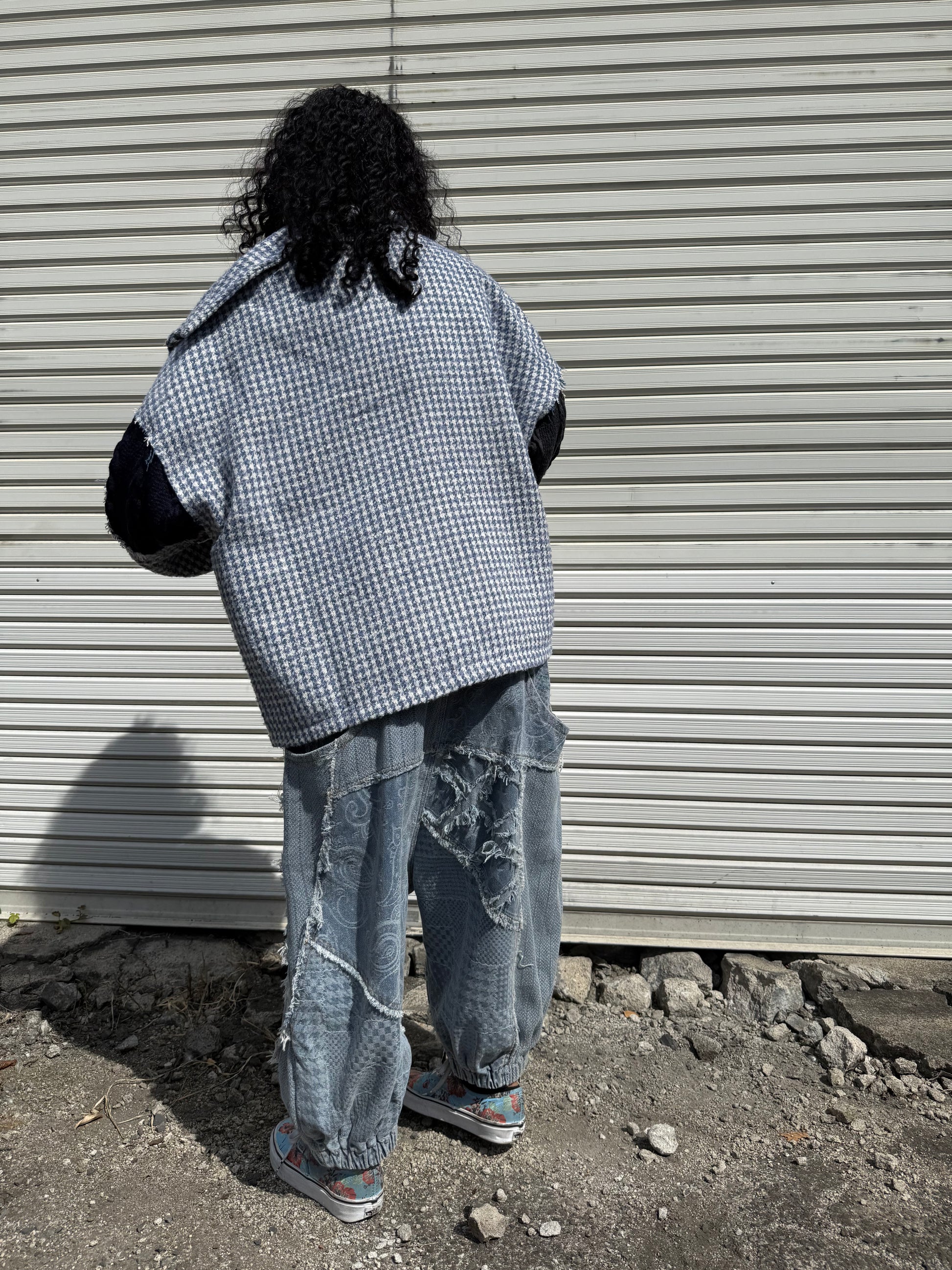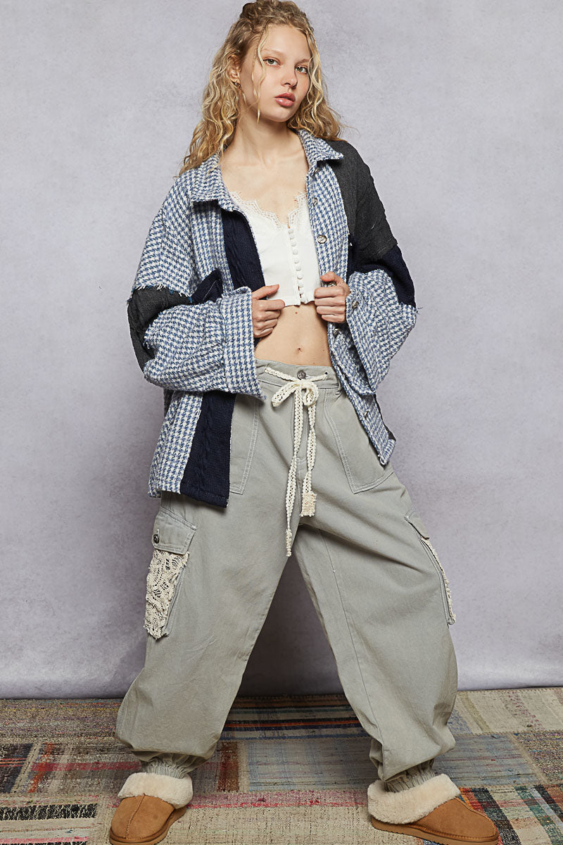 LAインポート「POL」ざっくりとした千鳥格子の織り生地に、ケーブルニット生地をアクセントにしたパッチワーク仕立てのルーズフィットオーバーサイズジャケット。異素材の切り替えがポイントで、羽織るだけでこなれ感のあるスタイルに。カジュアルからストリートまで幅広く活躍します。