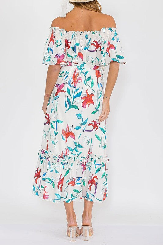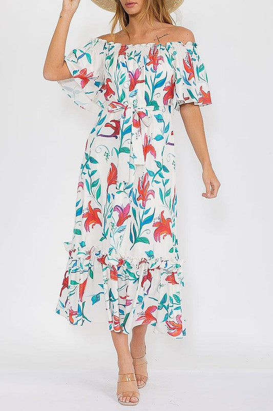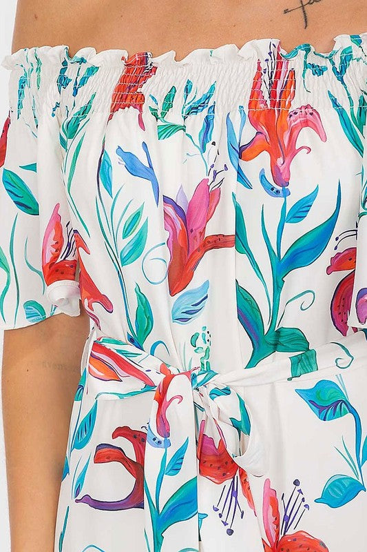 肩をすっきり見せるオフショルダー仕様で、リゾートや夏のお出かけにぴったりです。ウエストは同柄のリボンベルト付きでシルエットの調整も可能。軽やかなフレアスリーブと裾のフリルが女性らしい華やかさを演出します。