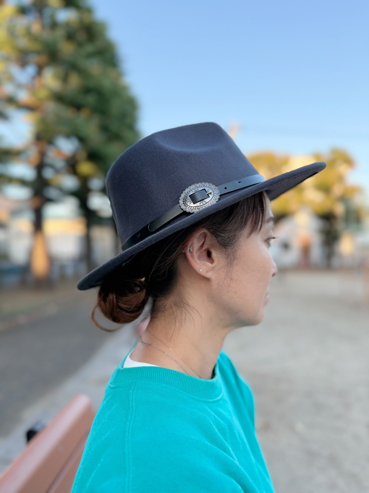 ブラックの上質なポリフェルト素材をベースに、ビンテージ感あるフェイクレザーバンドとコンチョ(飾りボタン)をあしらった“Fern”モデルハット。つば幅約3インチ(約7.6 cm)で、程よく顔まわりを覆いながら、シャープでスタイリッシュな印象を演出します。