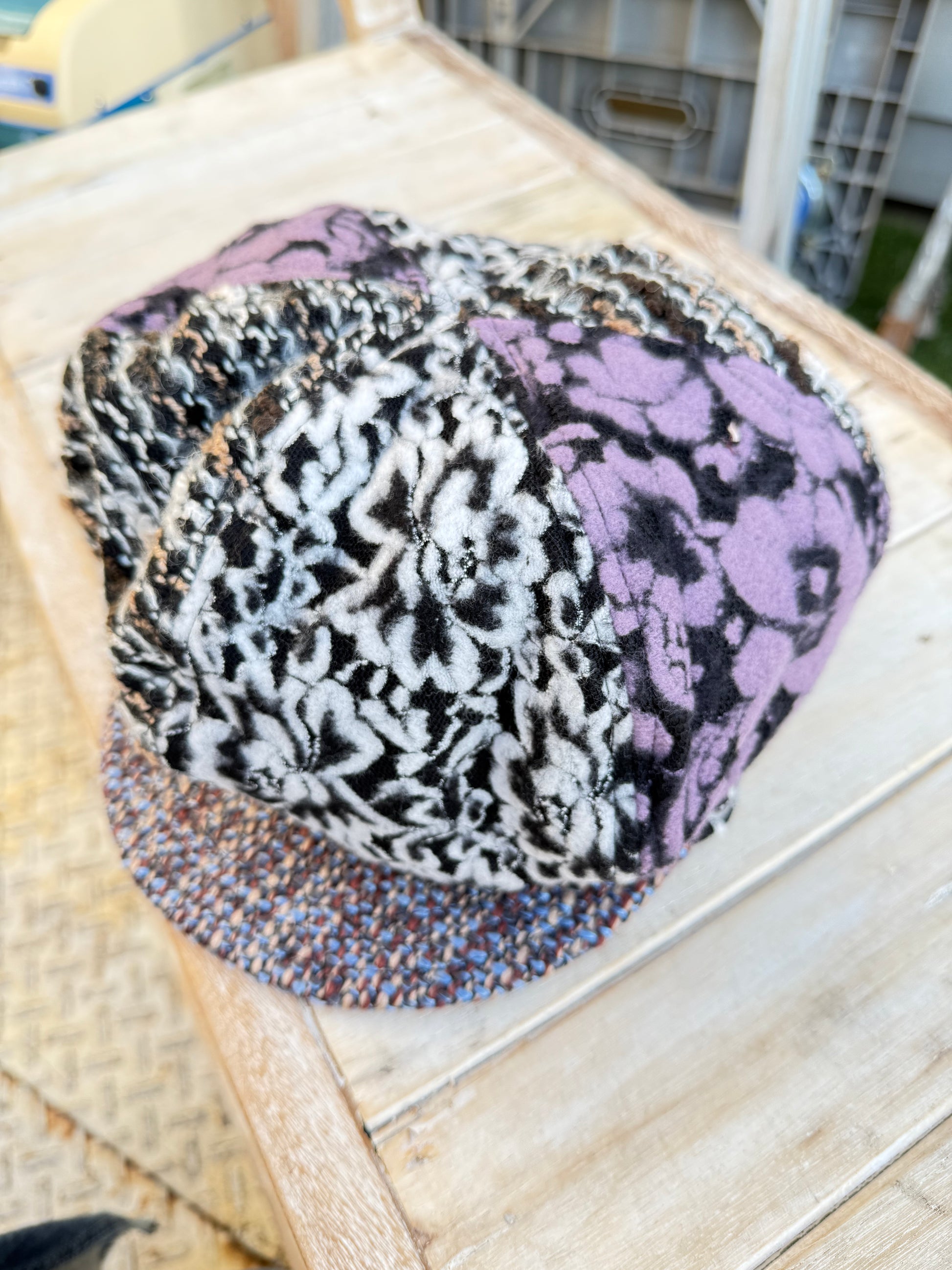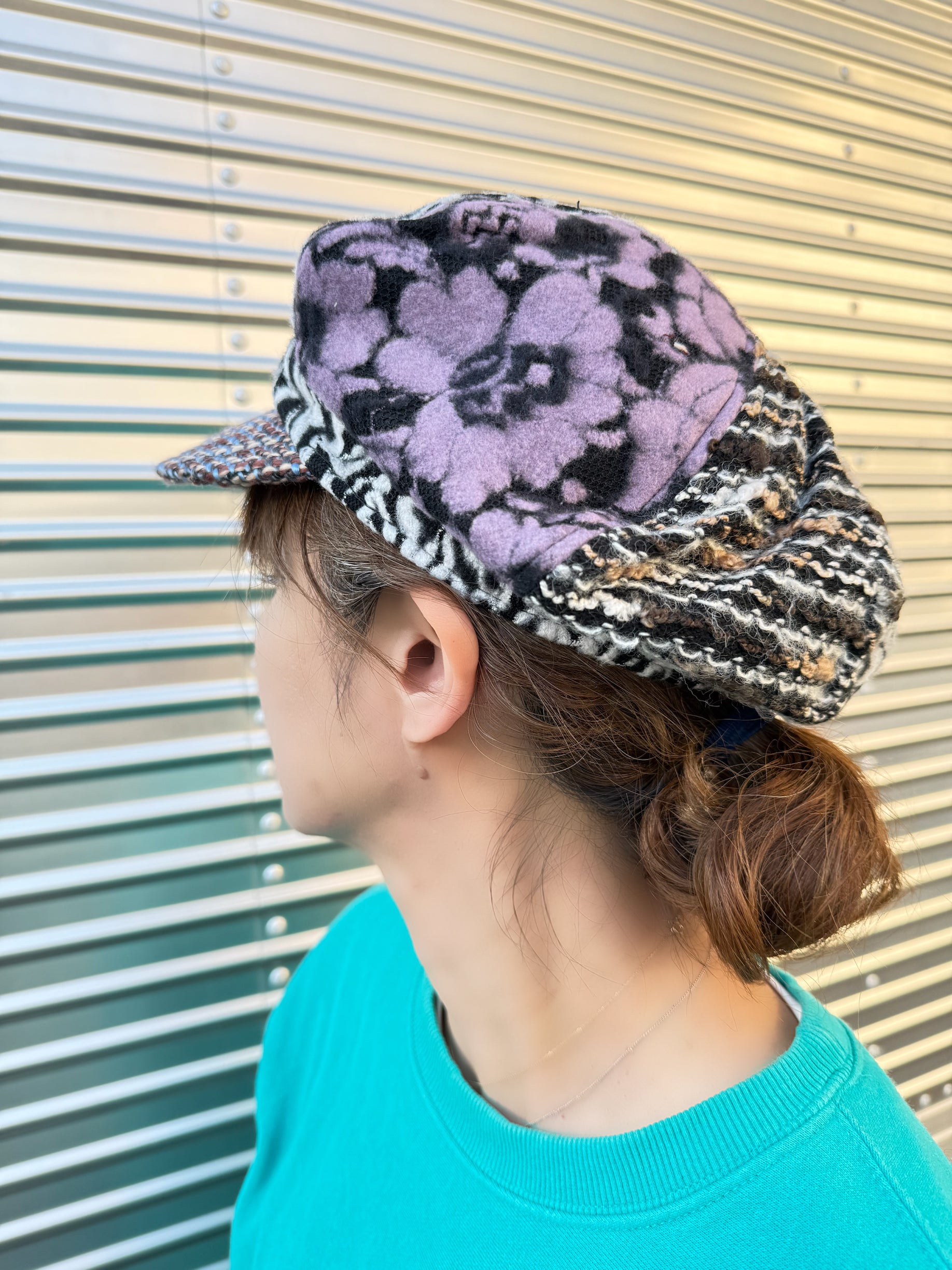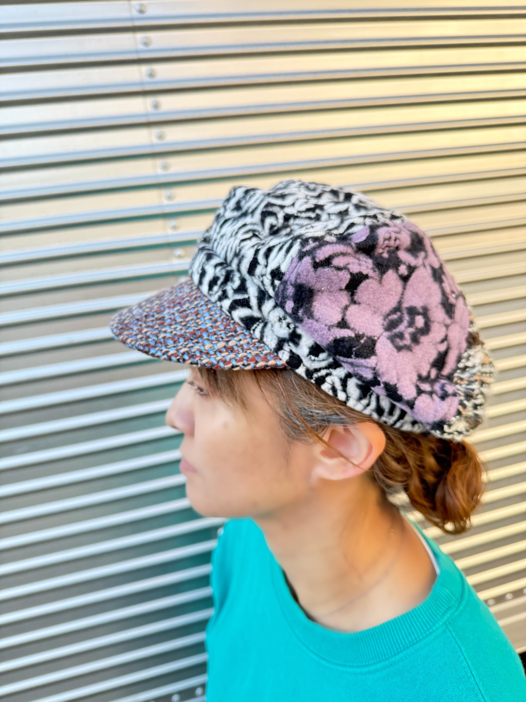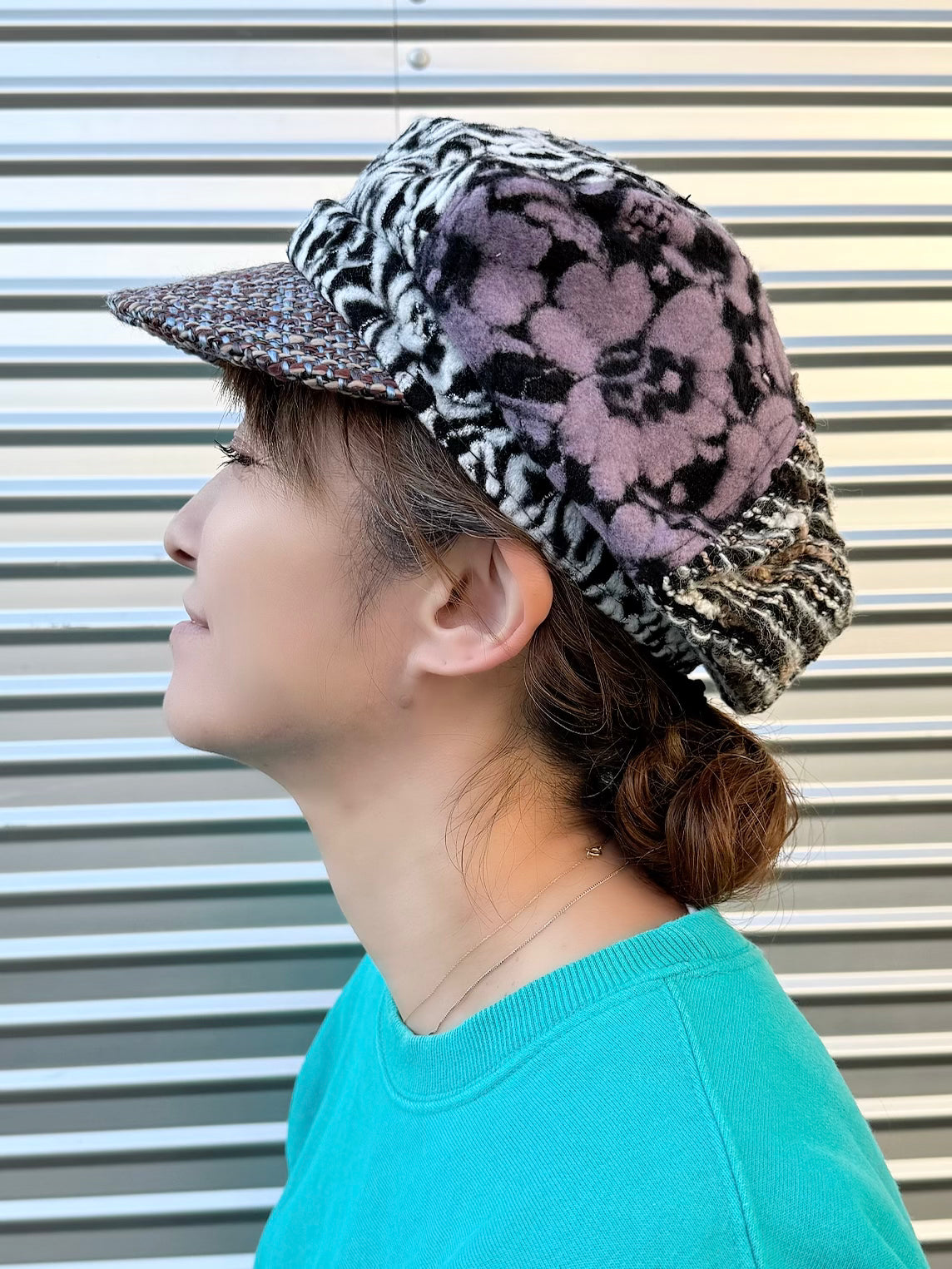 落ち着いたパープルとブラックを基調に、花柄を組み合わせたパッチワークデザインが魅力のニュースボーイ風キャスケット。つばにはミックスカラーのツイード素材を使用し、表情のあるスタイルに仕上がっていて、秋冬コーデのアクセントにぴったり。カジュアルにもフェミニンにも合わせやすい、個性的で雰囲気のあるアイテムです。