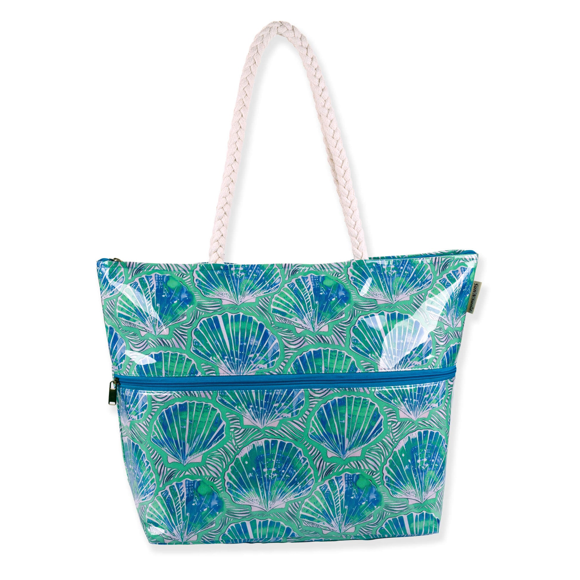 ターコイズとグリーンのミックスカラーのシェルで埋め尽くされたプリントが印象的な、ショルダートート。