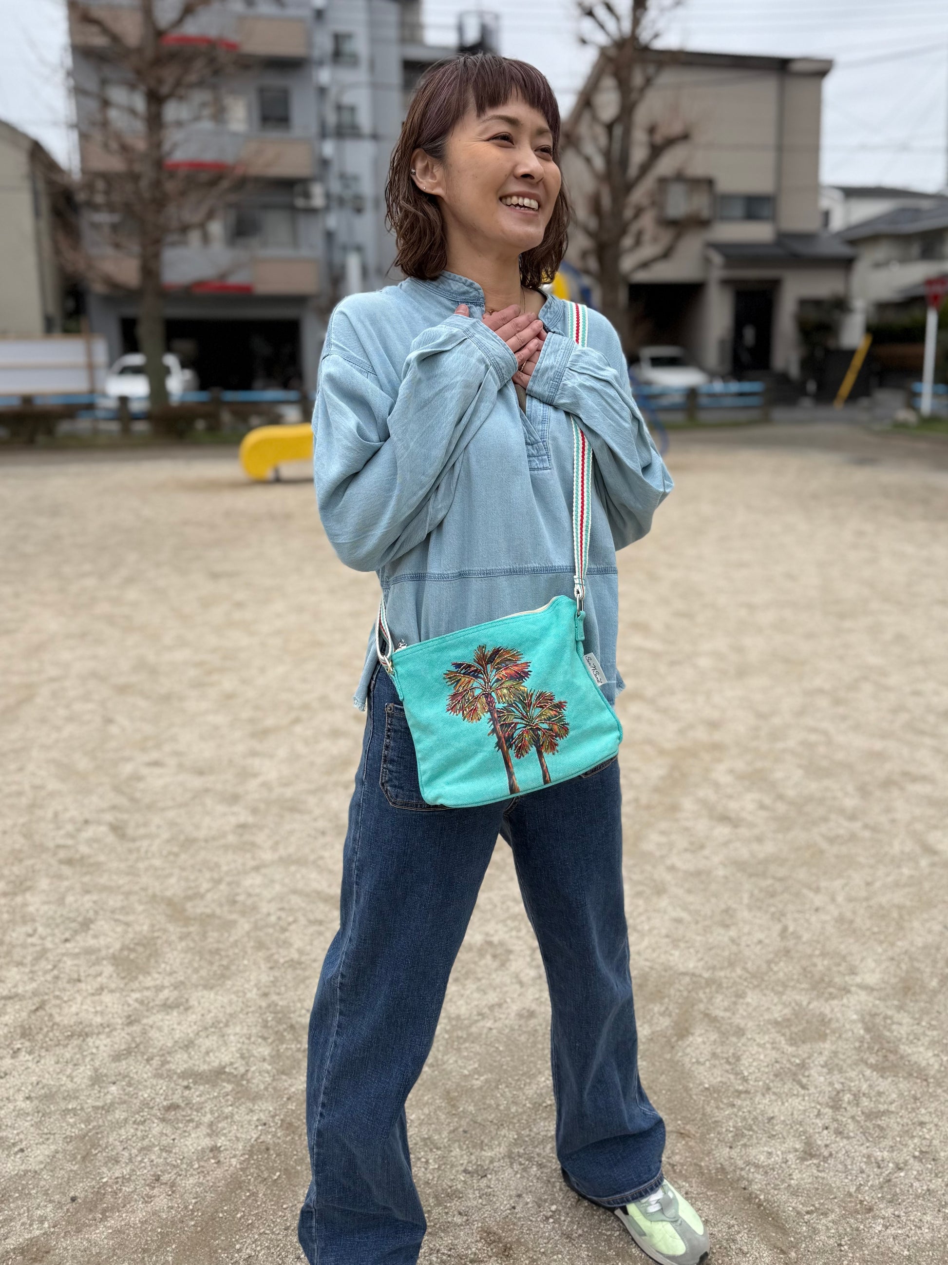 サンアンドサンド、爽やかなパームツリープリントが目を引くクロスボディバッグ。