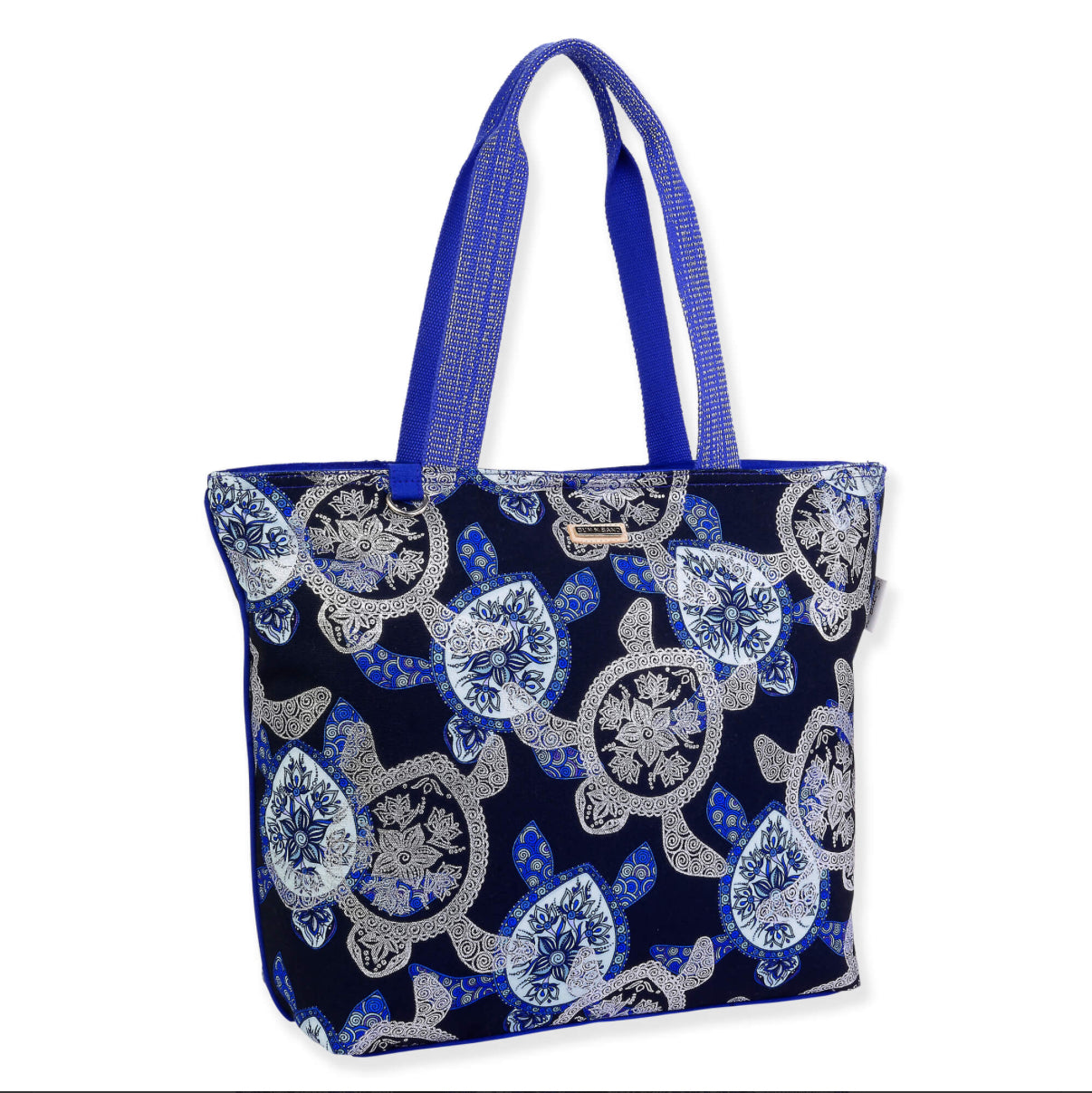 サンアンドサンド、ホヌ柄が存在感たっぷりのトートバッグ。濃いめネイビー地で、夏だけではなく、デイリーにも活躍、軽くてたっぷり入る使いやすいサイズです。
