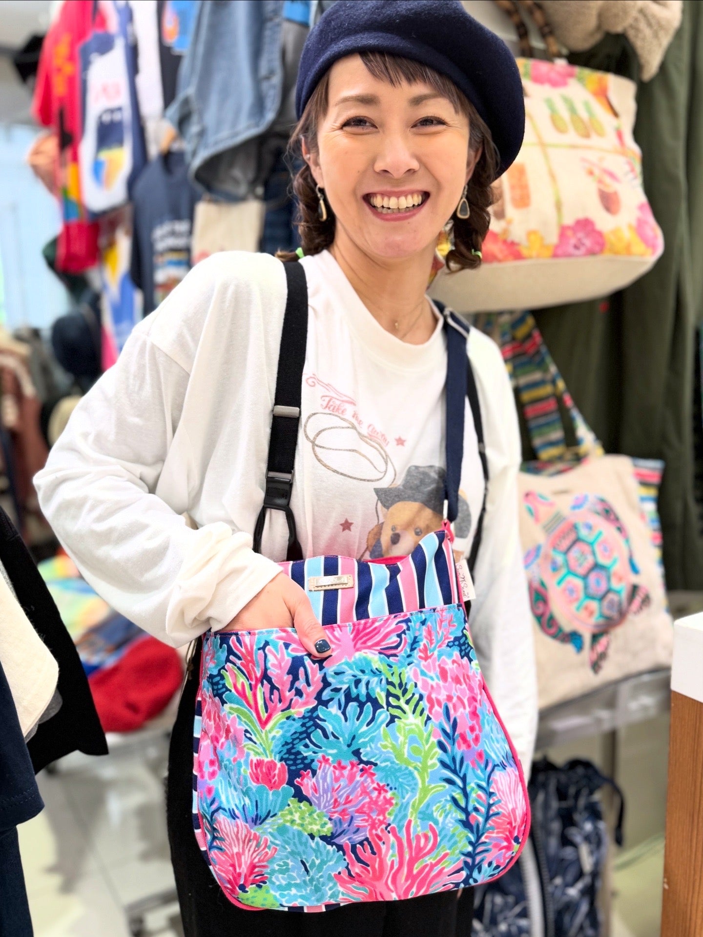 サンアンドサンド カラフルなコーラル柄に、上部のストライプデザインが映えるショルダーバッグ。