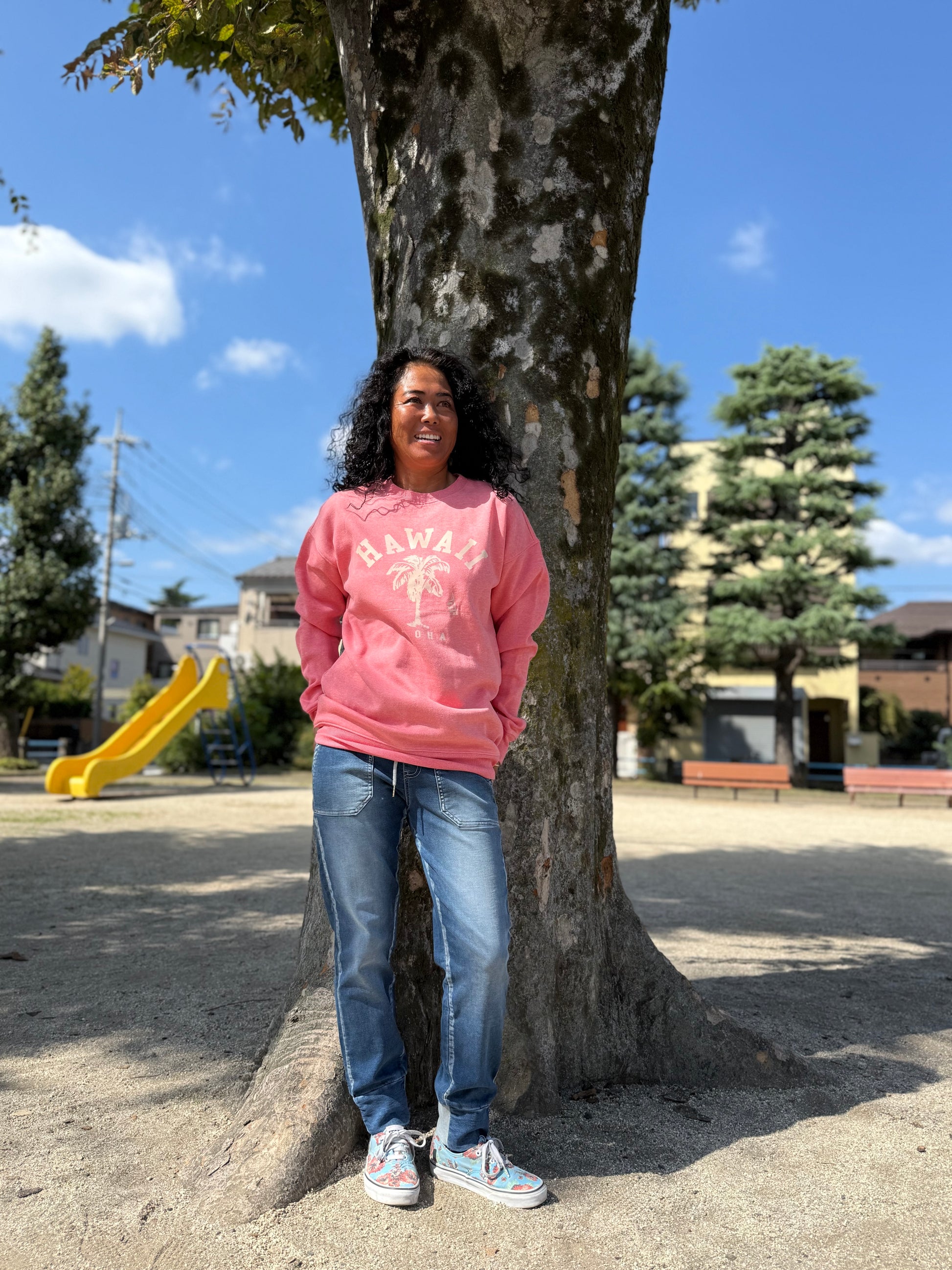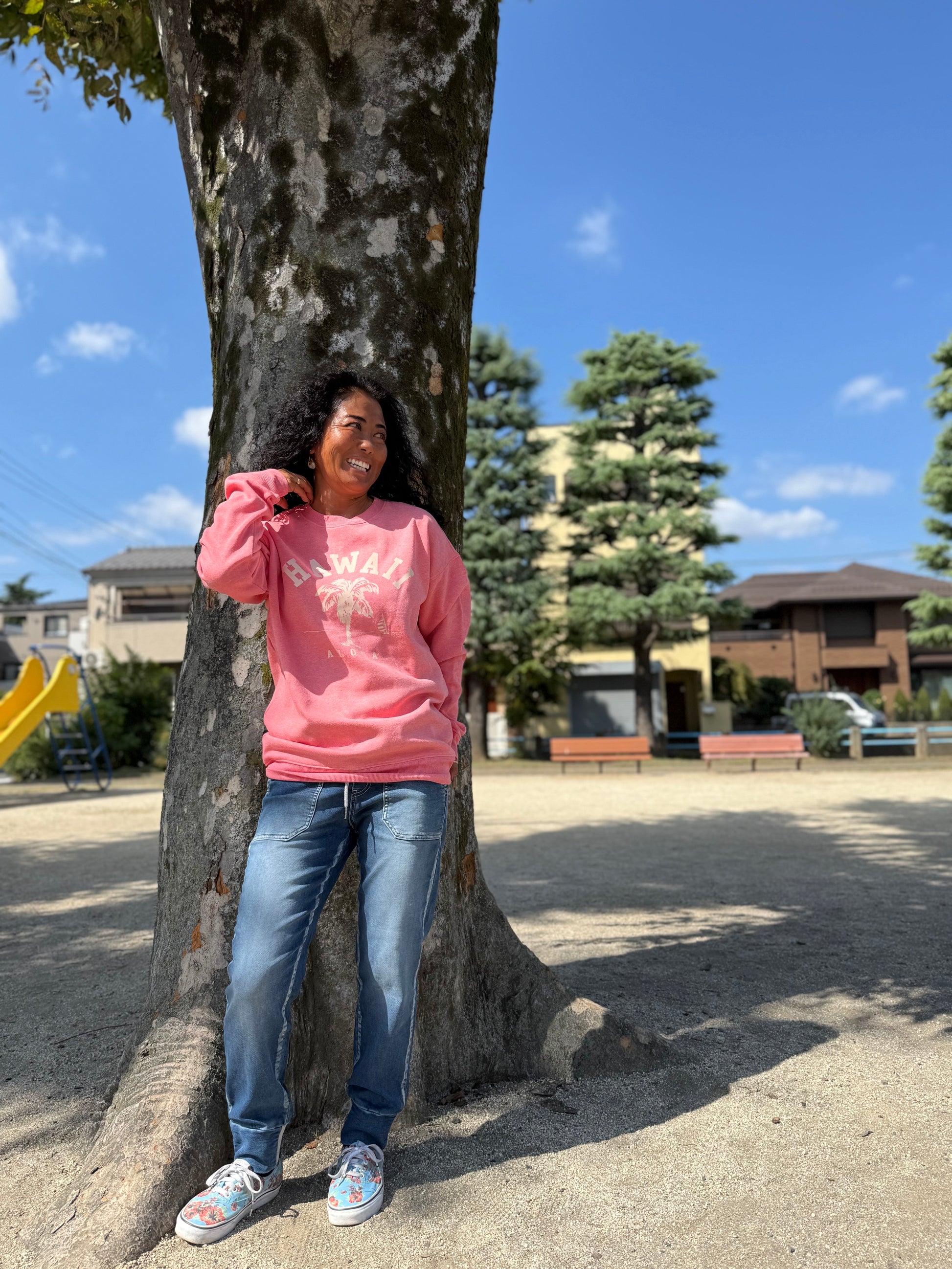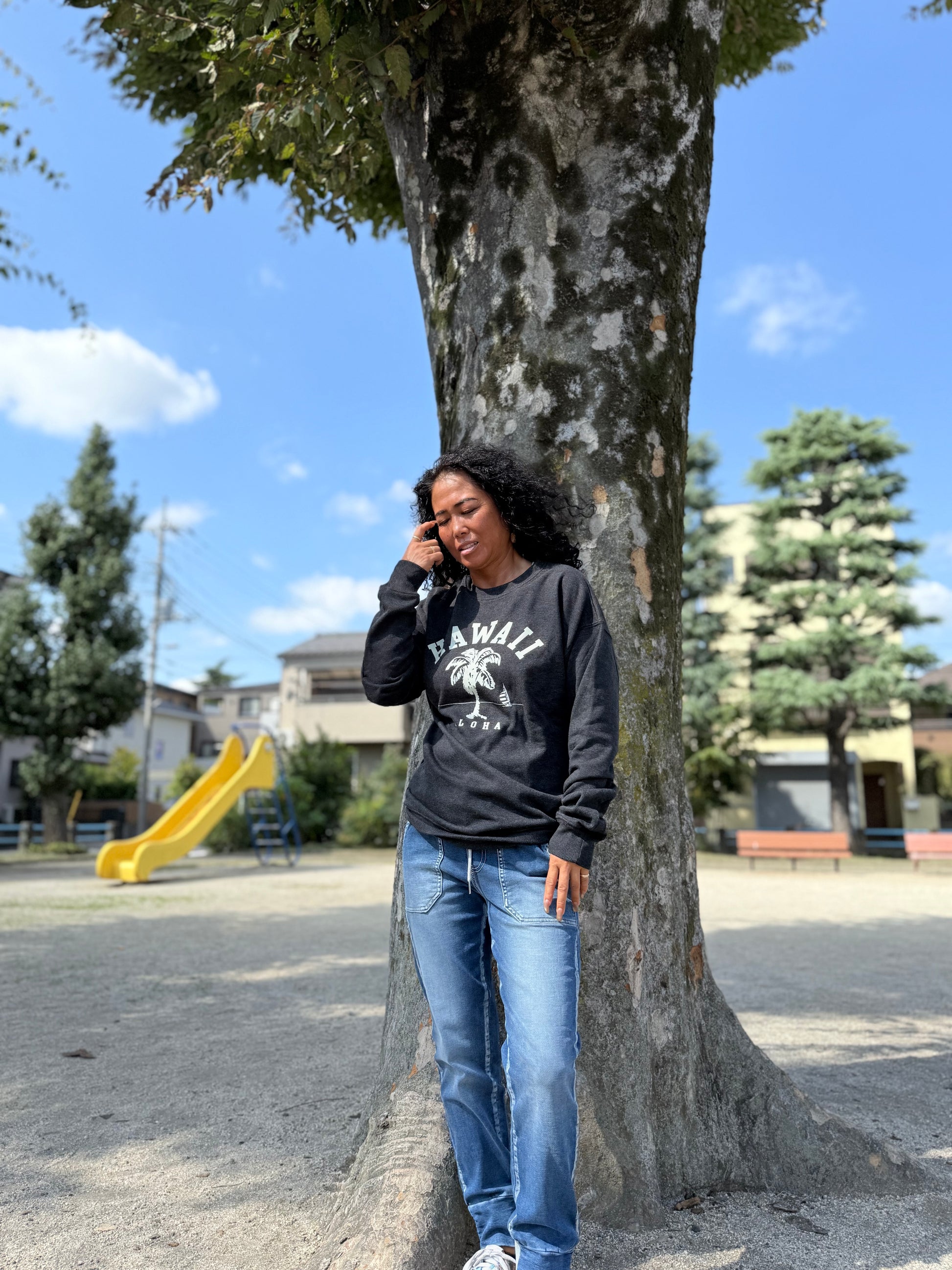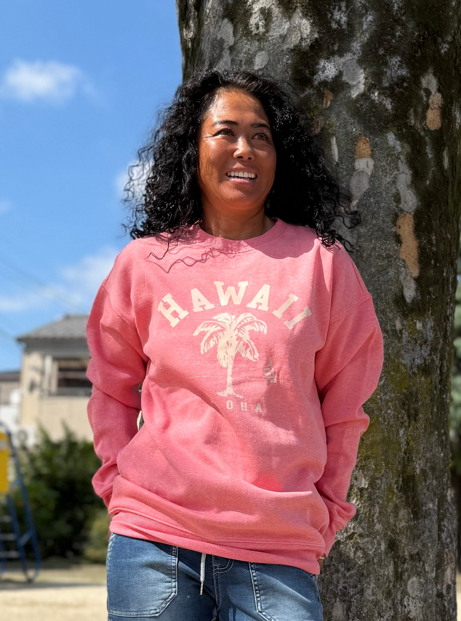 LAインポート「Honestee」の「Hawaii Aloha」の文字とパームツリーを描いた、リゾート感あふれるスウェットシャツ。軽やかな薄手の生地感で、内側はふんわりとした裏起毛仕様。ゆったりとしたオーバーサイズシルエットでインナーも重ねやすく、長めの丈がお尻まで隠れるデザインです。