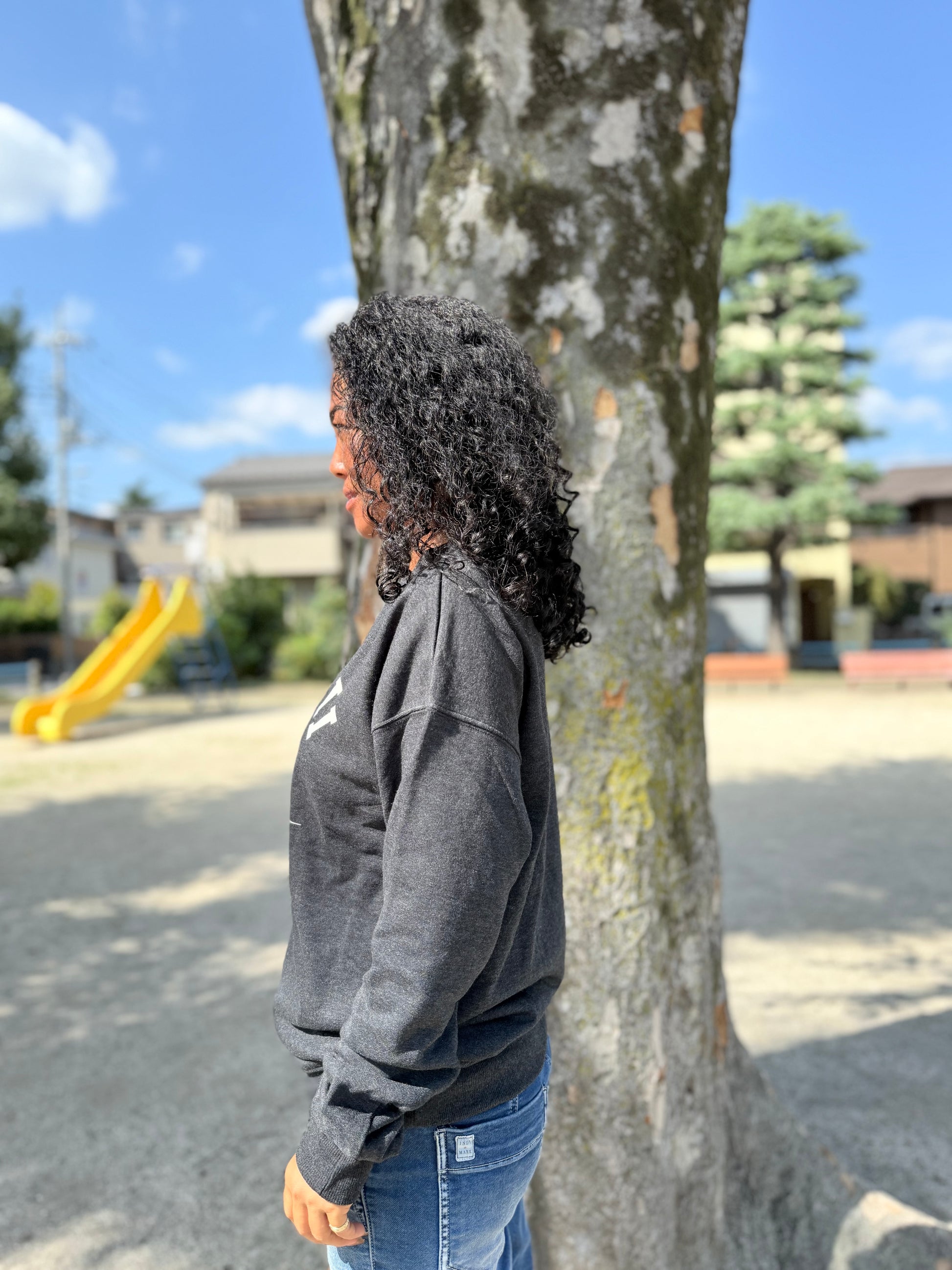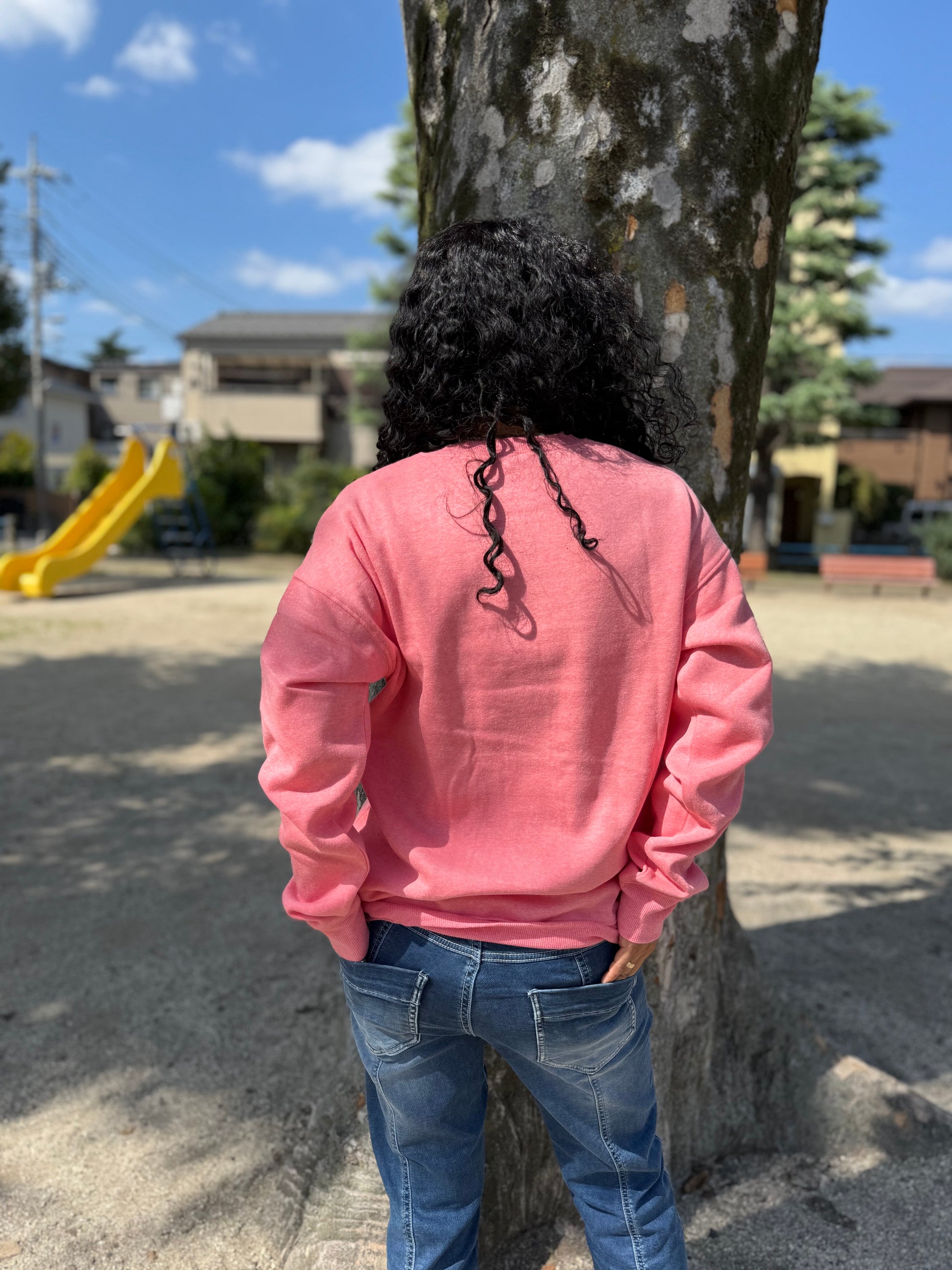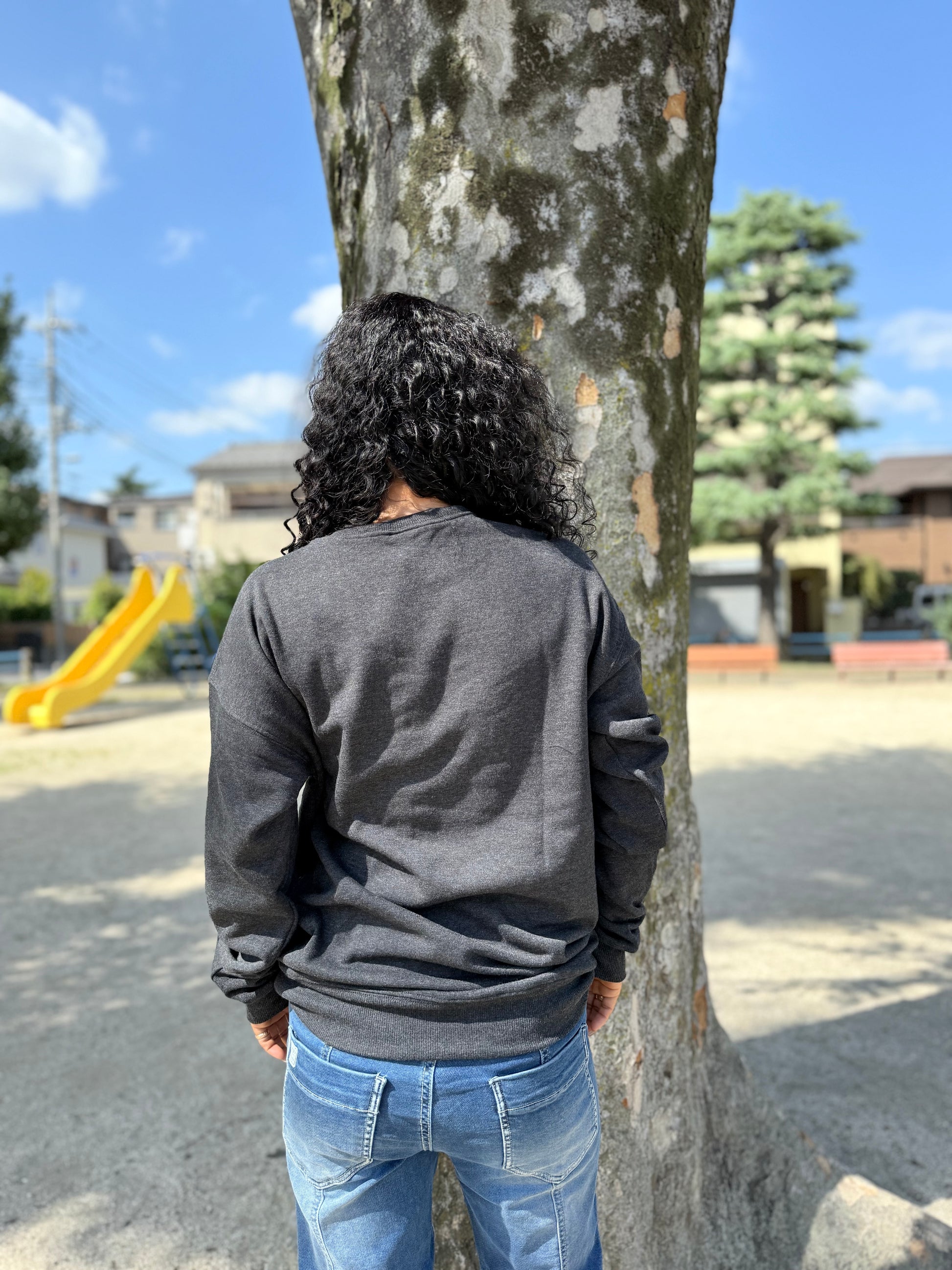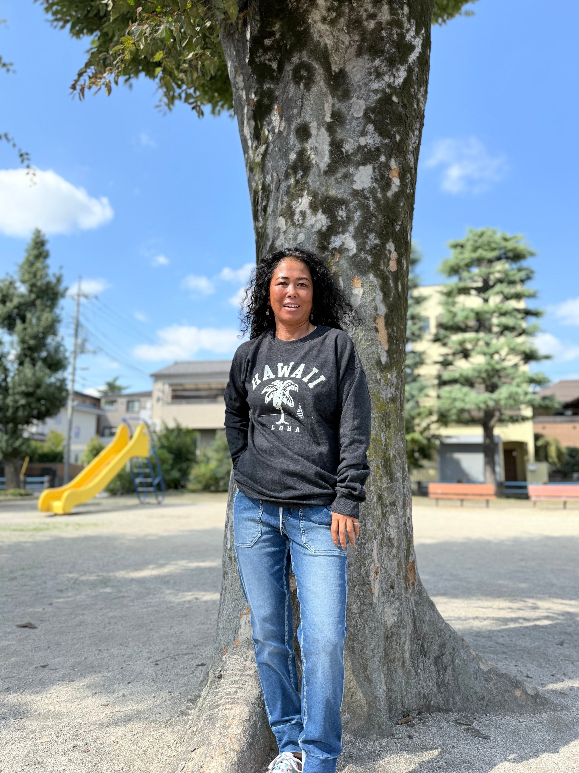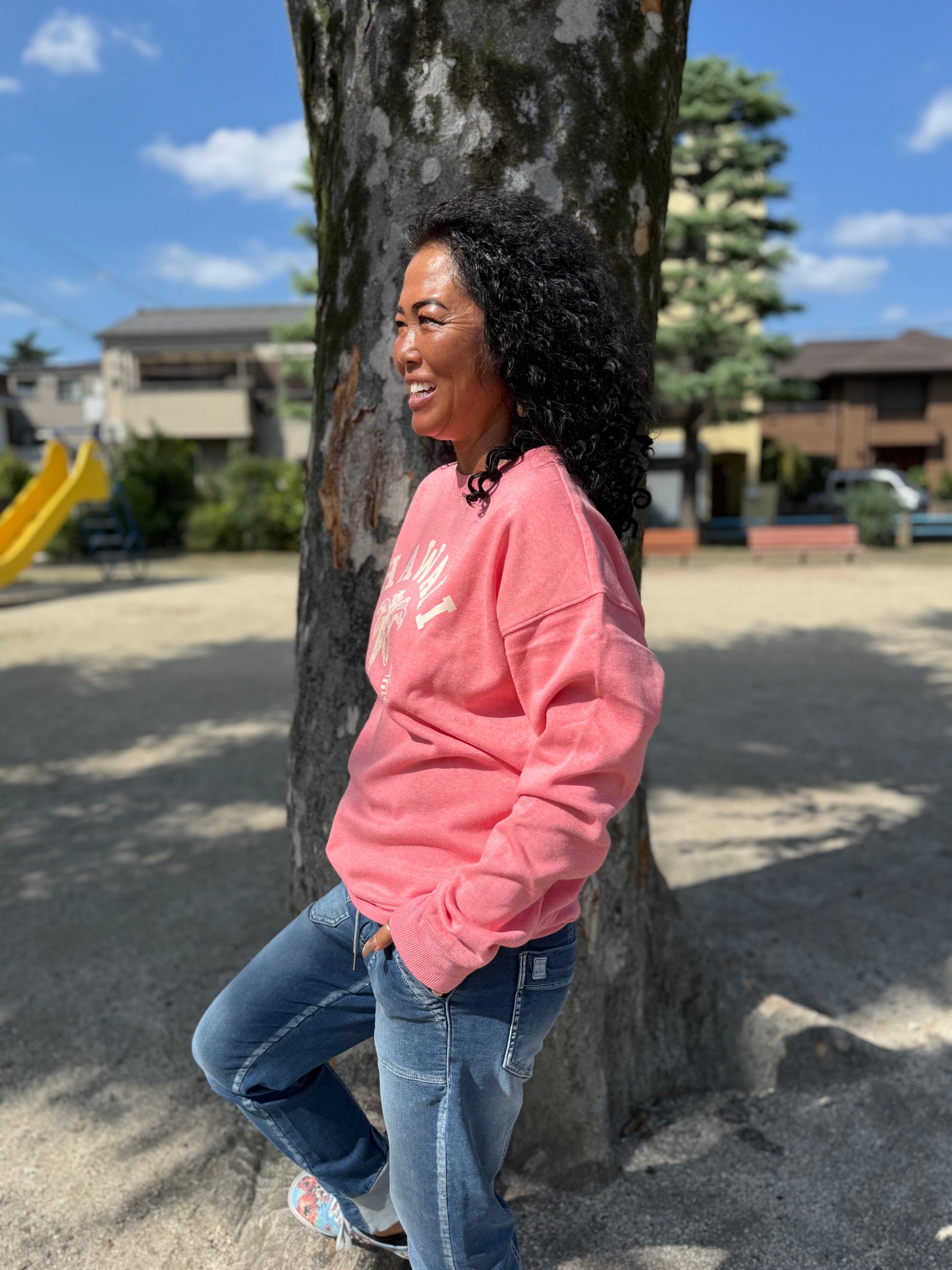 LAインポート「Honestee」の「Hawaii Aloha」の文字とパームツリーを描いた、リゾート感あふれるスウェットシャツ。軽やかな薄手の生地感で、内側はふんわりとした裏起毛仕様。ゆったりとしたオーバーサイズシルエットでインナーも重ねやすく、長めの丈がお尻まで隠れるデザインです。